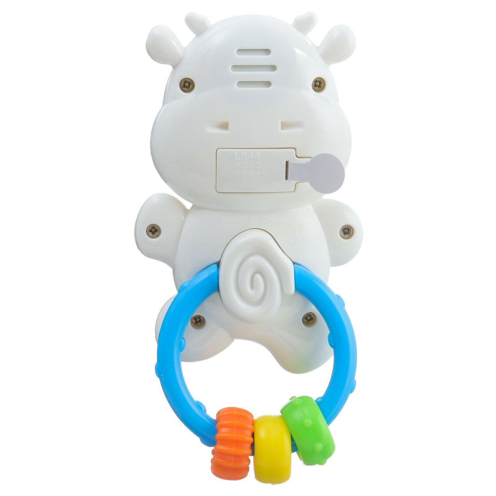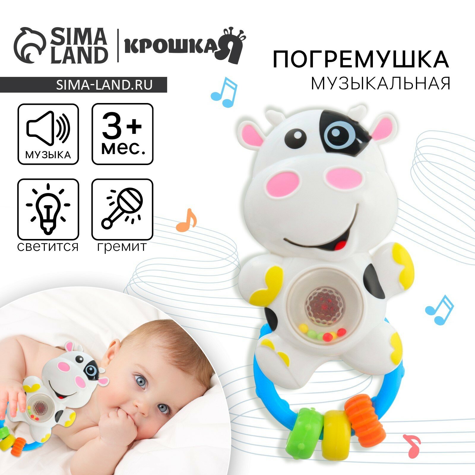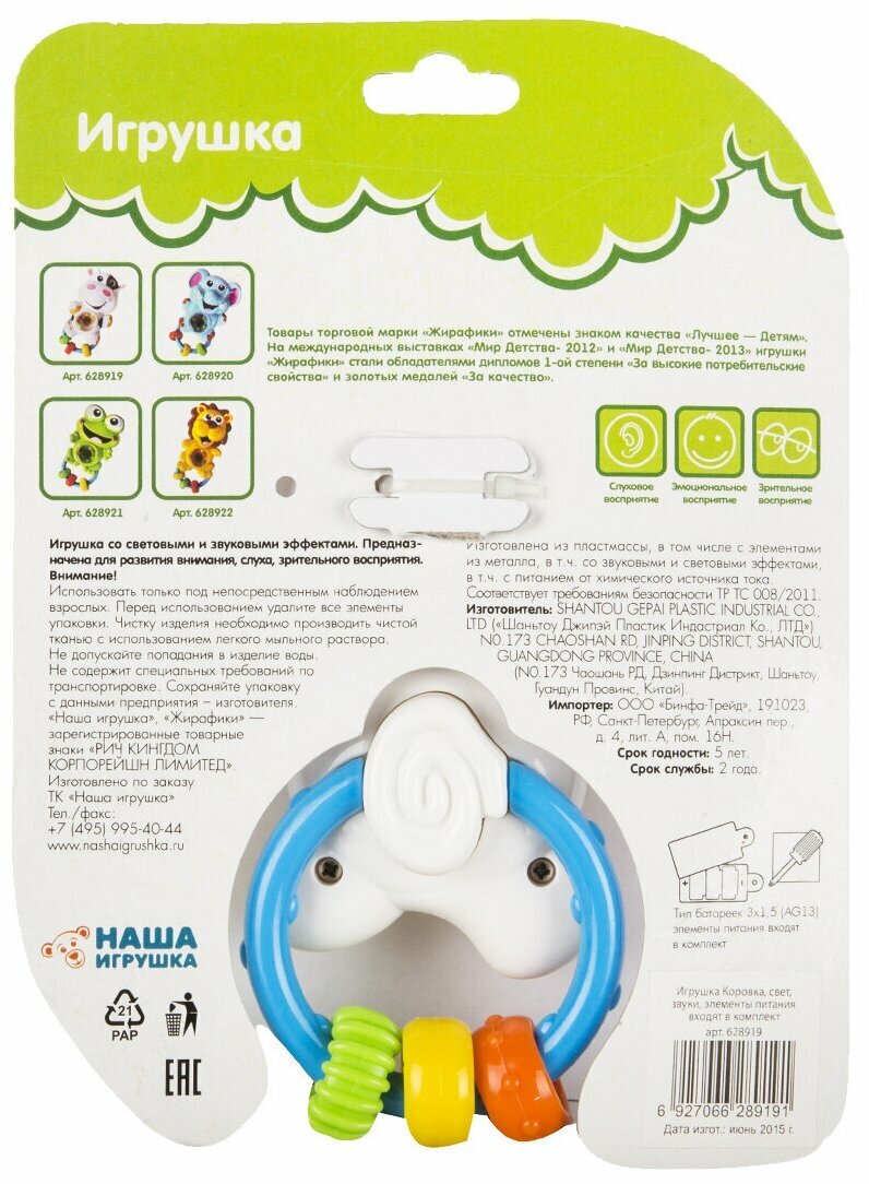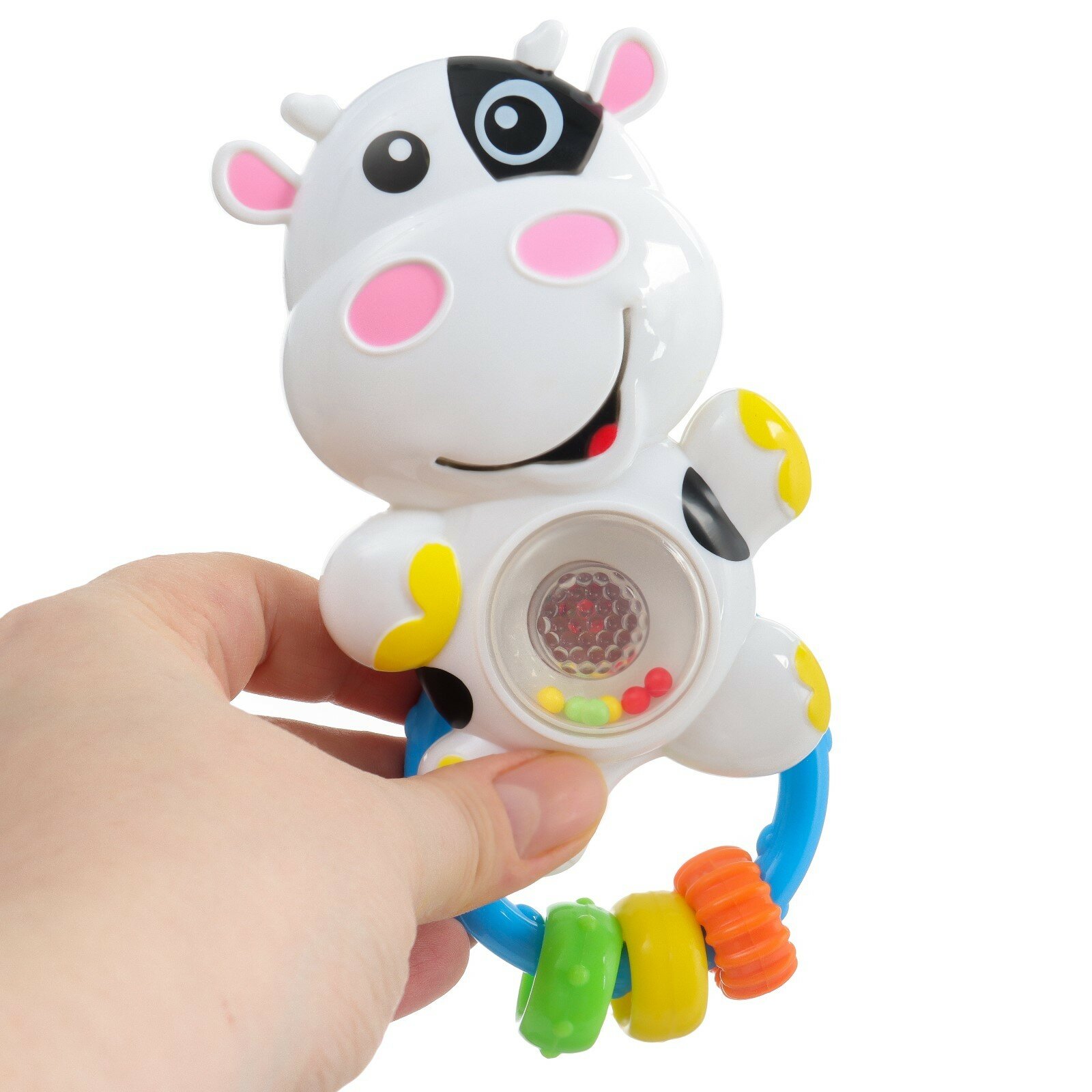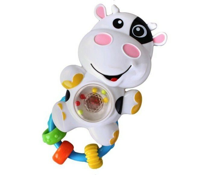 | Отзыв: | В самой коровке три длинных мелодии и два звука. При проигрывании музыке на пузике коровки горит красный свет, что помимо самих мелодий привлекает внимание ребёнка ещё больше. Есть колечки, которые тоже приятно гремят. В целом за такие деньги чудесная погремушка. Детю нравится) |