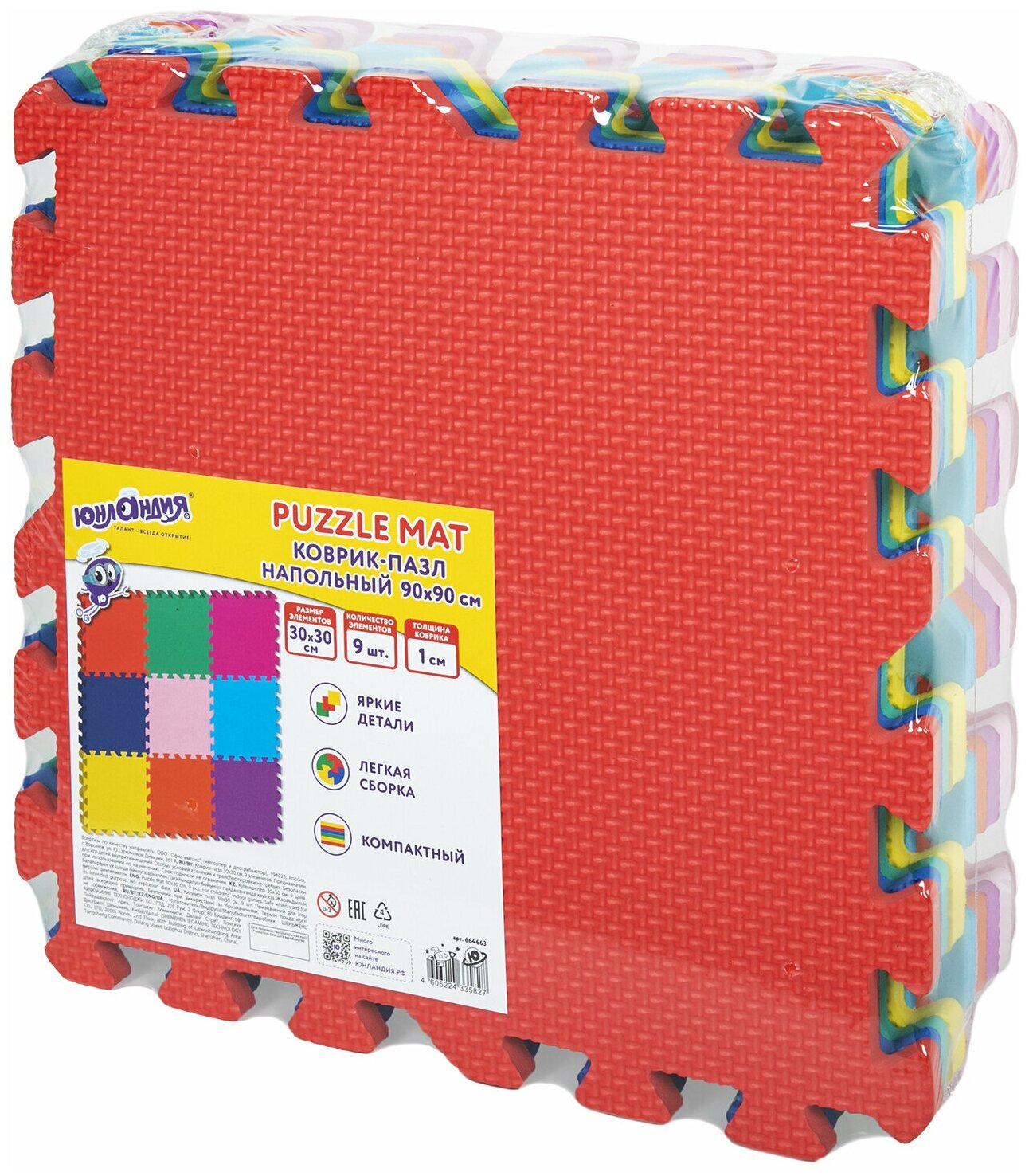 Купить Коврик - пазл детский развивающий складной игровой для детей модульный для ползания 0,9*0,9 м цветной, 9 элементов 30*30 см, толщина 1 см, Юнландия, 664663