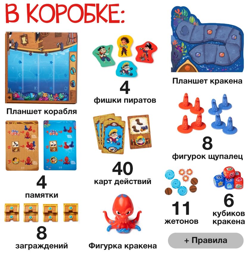 | Дополнительная информация | Атака Кракена – это захватывающее кооперативное приключение для юных пиратов и их родителей. Несложные правила, быстрые партии и очаровательные иллюстрации – идеальный набор для семейной игры. А самое классное, что здесь нет конкуренции – вы выигрываете или проигрываете все вместе, а потому никто не останется в обиде. |