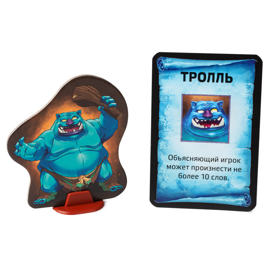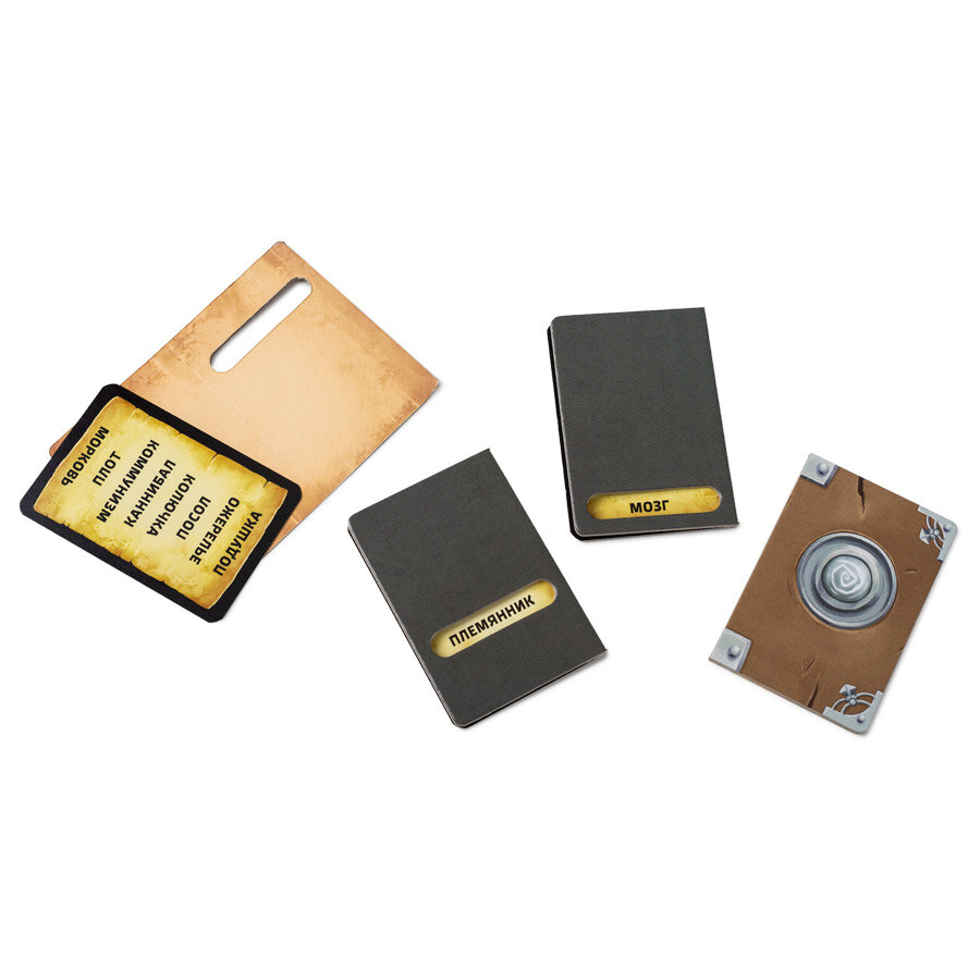 | Комплектация | 50 двухсторонних карт слов (400 фэнтезийных и 400 обычных слов), 10 карт монстров, 10 карт проклятий, 7 картонных жетонов комнат, 4 картонных жетона книг, 2 картонных жетона факелов, 3 пластиковых подставки, блокнот с листами для записи слов-ловушек, 2 карандаша, песочные часы, буклет, правила игры |