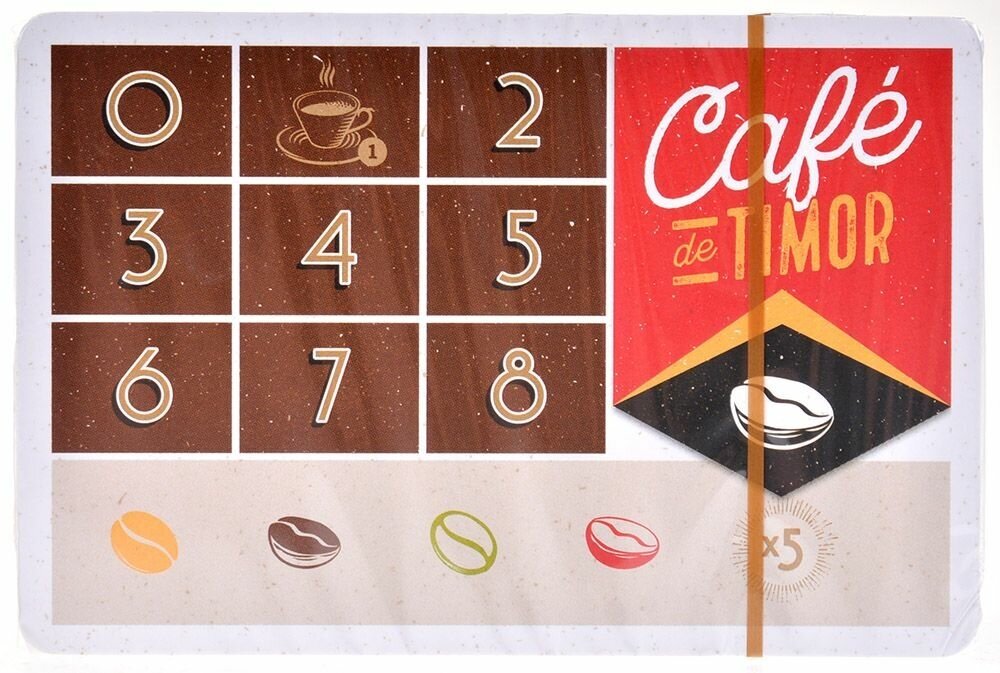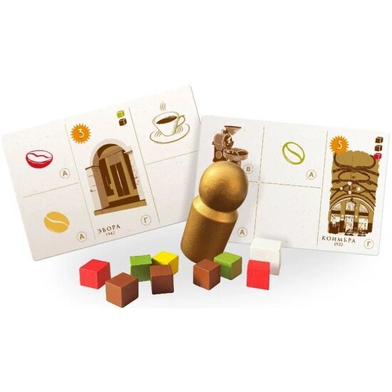 | Комплектация | 56 базовых карт, 140 разноцветных кубов (по 35 каждого цвета), 4 больших белых куба, деревянная фишка мастера, промокарта, 8 карт дополнения Эспрессо, правила |