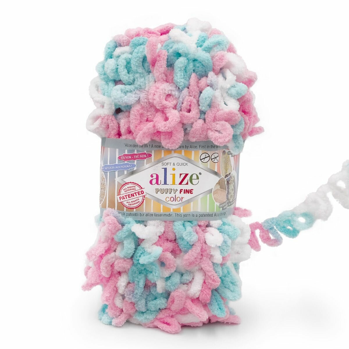 Пряжа Alize Puffy Fine Color (Пуффи Файн Колор) - 1 моток цвет: 5949 Желтый / бирюзовый / розовый / белый / голубой 100% микрополиэстер 100г 14м