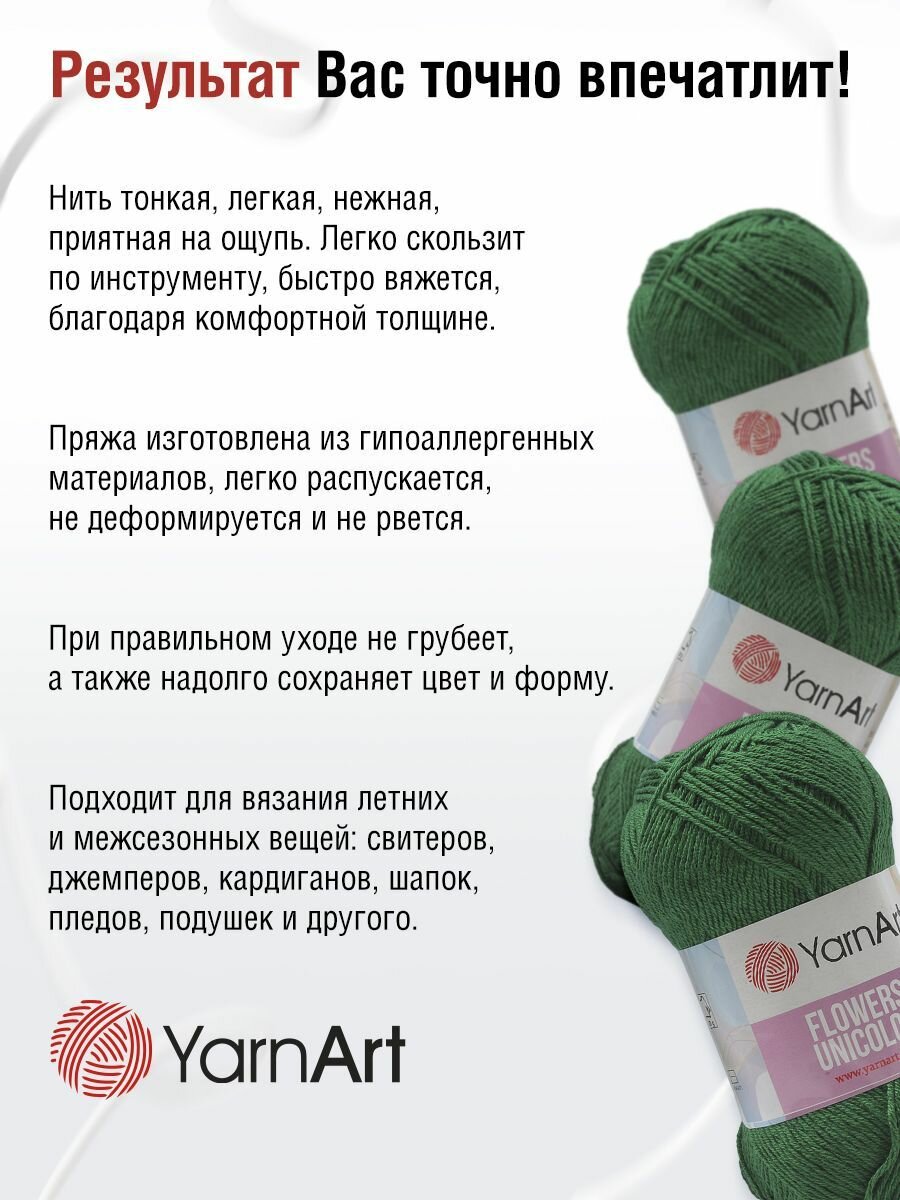 СохранитьПряжа Flowers Unicolor YarnArt, зеленый - 758, 55% хлопок, 45% акрил, 5 мотков, 50 г., 200 м. интересное: