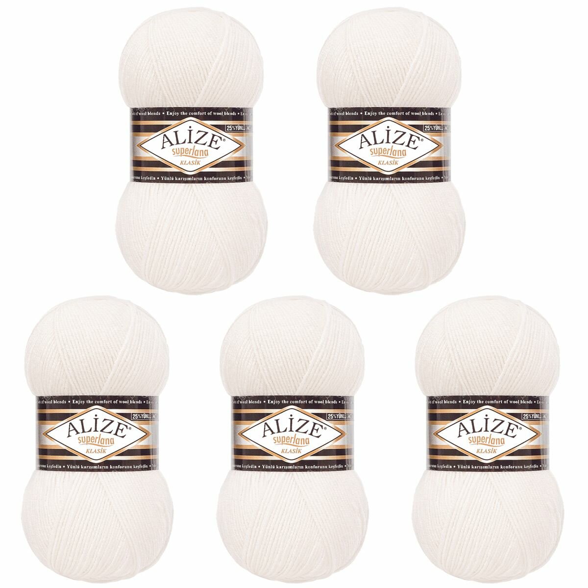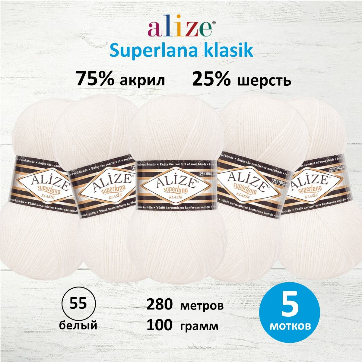 Купить Пряжа Alize Superlana klasik белый (55), 25%шерсть/75%акрил, 280м, 100г, 5шт