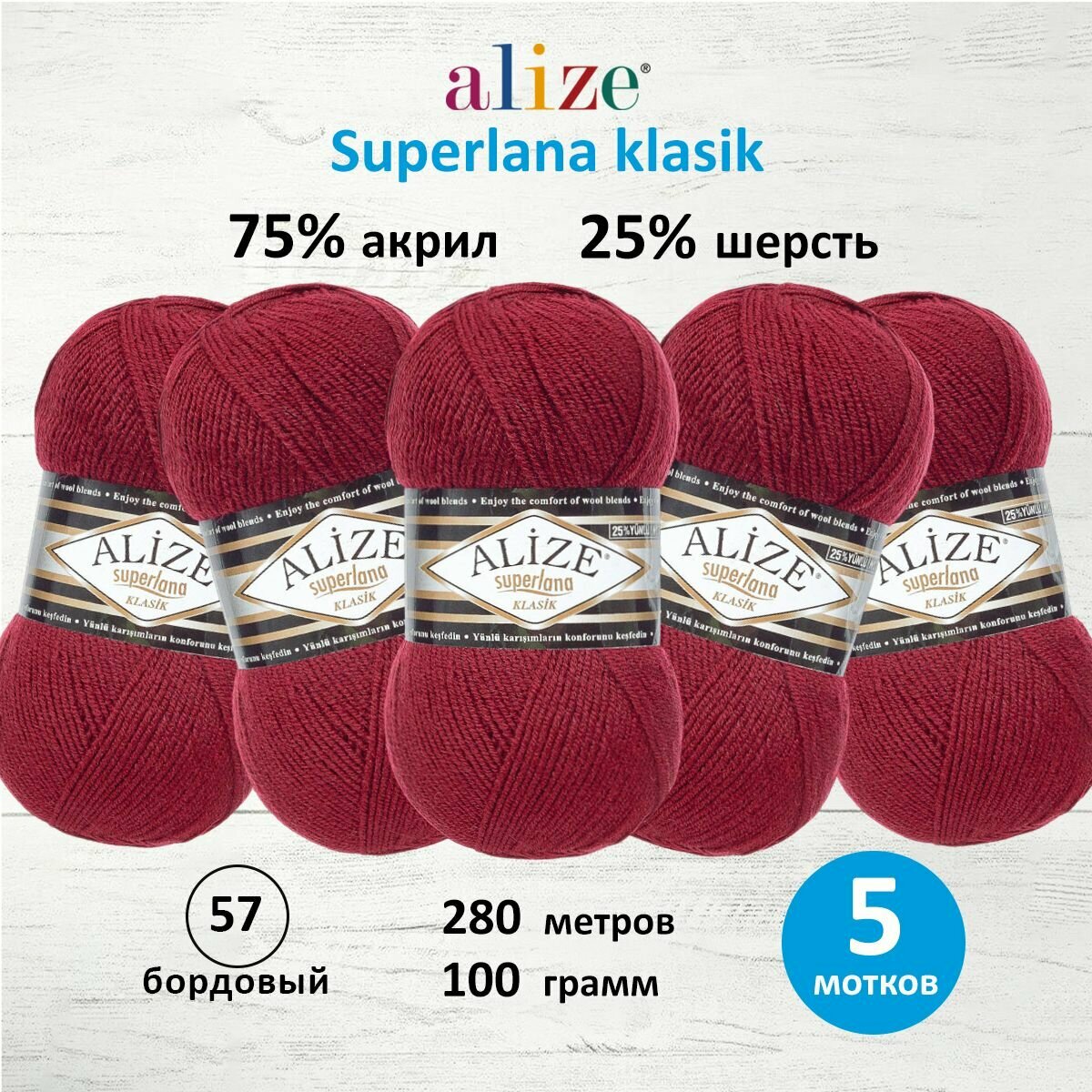 Купить Пряжа Alize Superlana klasik бордовый (57), 25%шерсть/75%акрил, 280м, 100г, 5шт