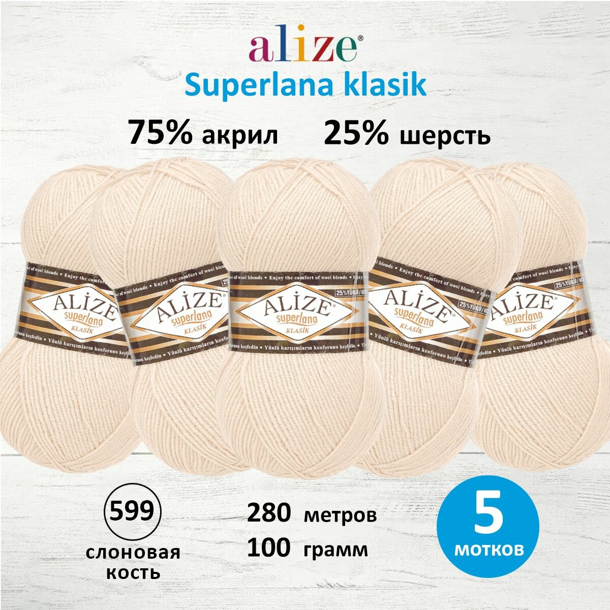 Купить Пряжа Alize Superlana klasik слоновая кость (599), 25%шерсть/75%акрил, 280м, 100г, 5шт
