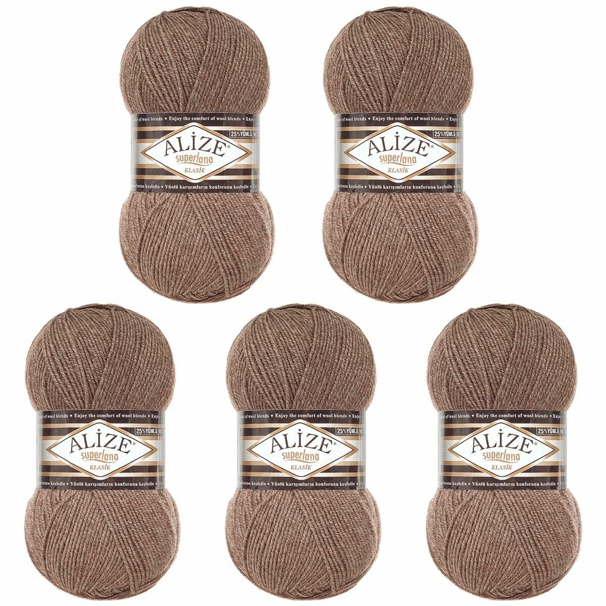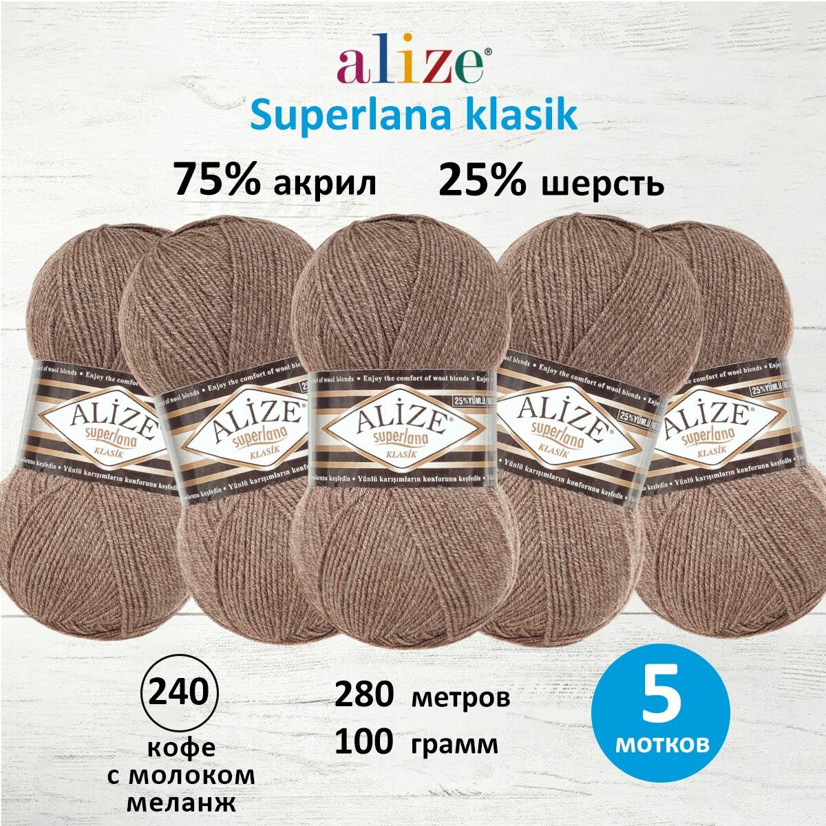 Купить Пряжа для вязания ALIZE 'Superlana klasik', 100г, 280м (акрил, шерсть), ТУ (240 кофе с молоком меланж), 5 мотков