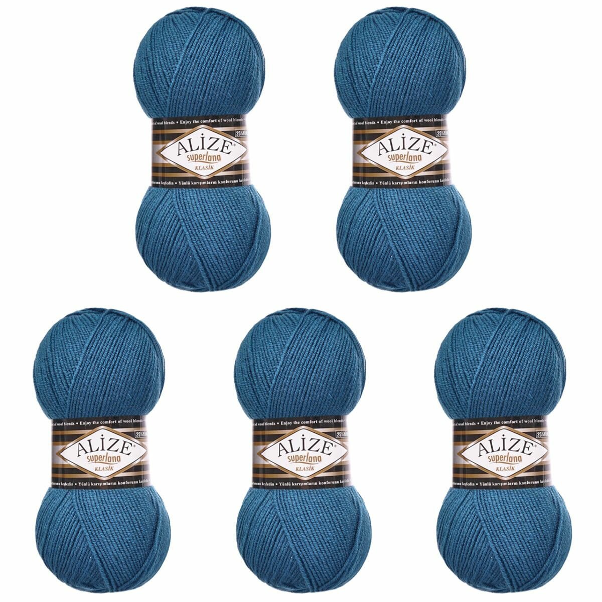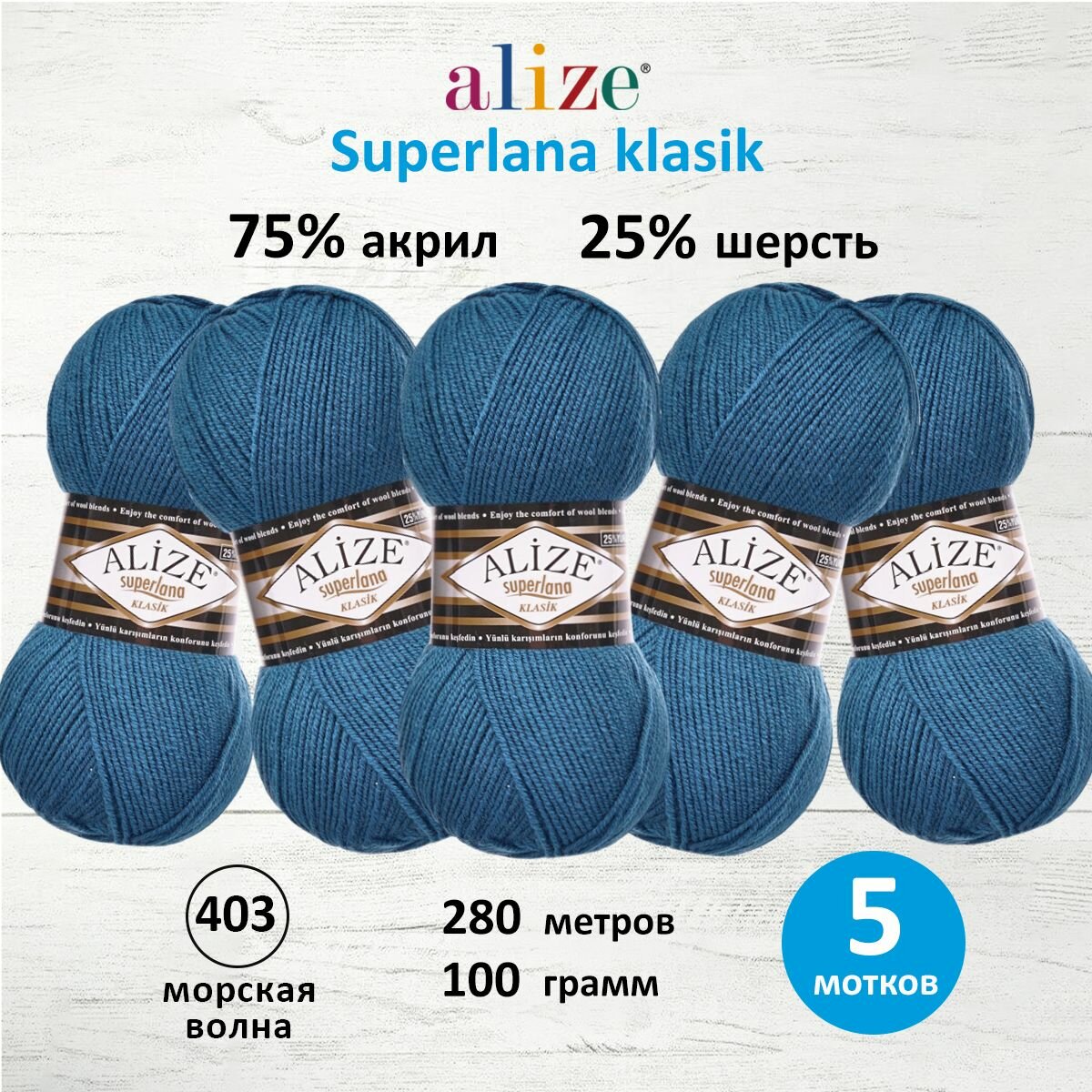 Купить Пряжа Alize Superlana klasik морская волна (403), 25%шерсть/75%акрил, 280м, 100г, 5шт