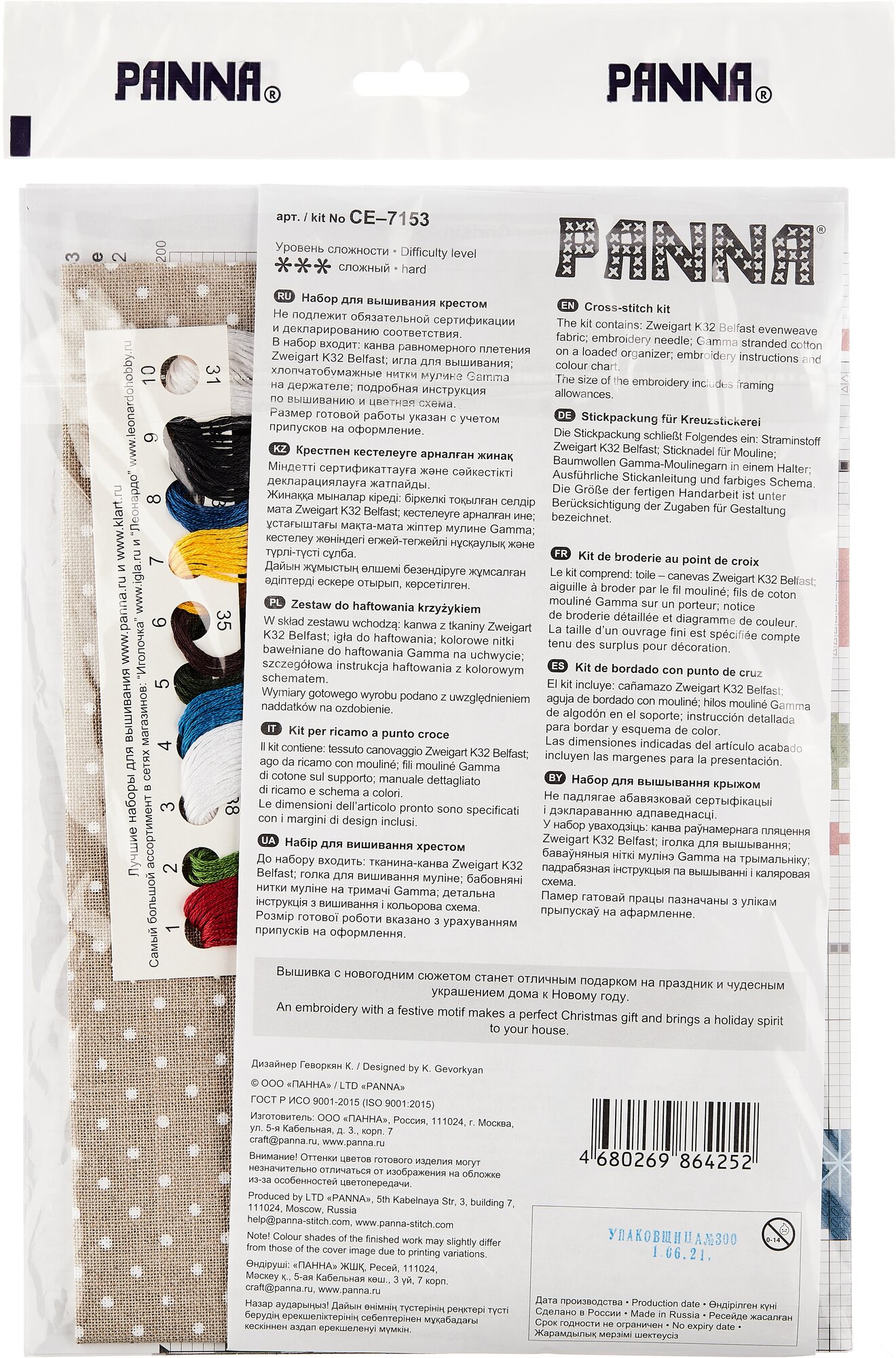 | Комплектация | канва аппретированная К04, хлопчатобумажные нитки мулине на держателе, игла для вышивания, подробная инструкция по вышиванию и схема |