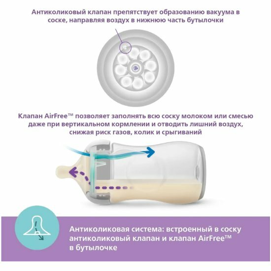 | Дополнительная информация | Предназначено для дополнительной защиты от колик, газов и срыгивания. Конструкция соски позволяет избежать случайное проливание молока. |