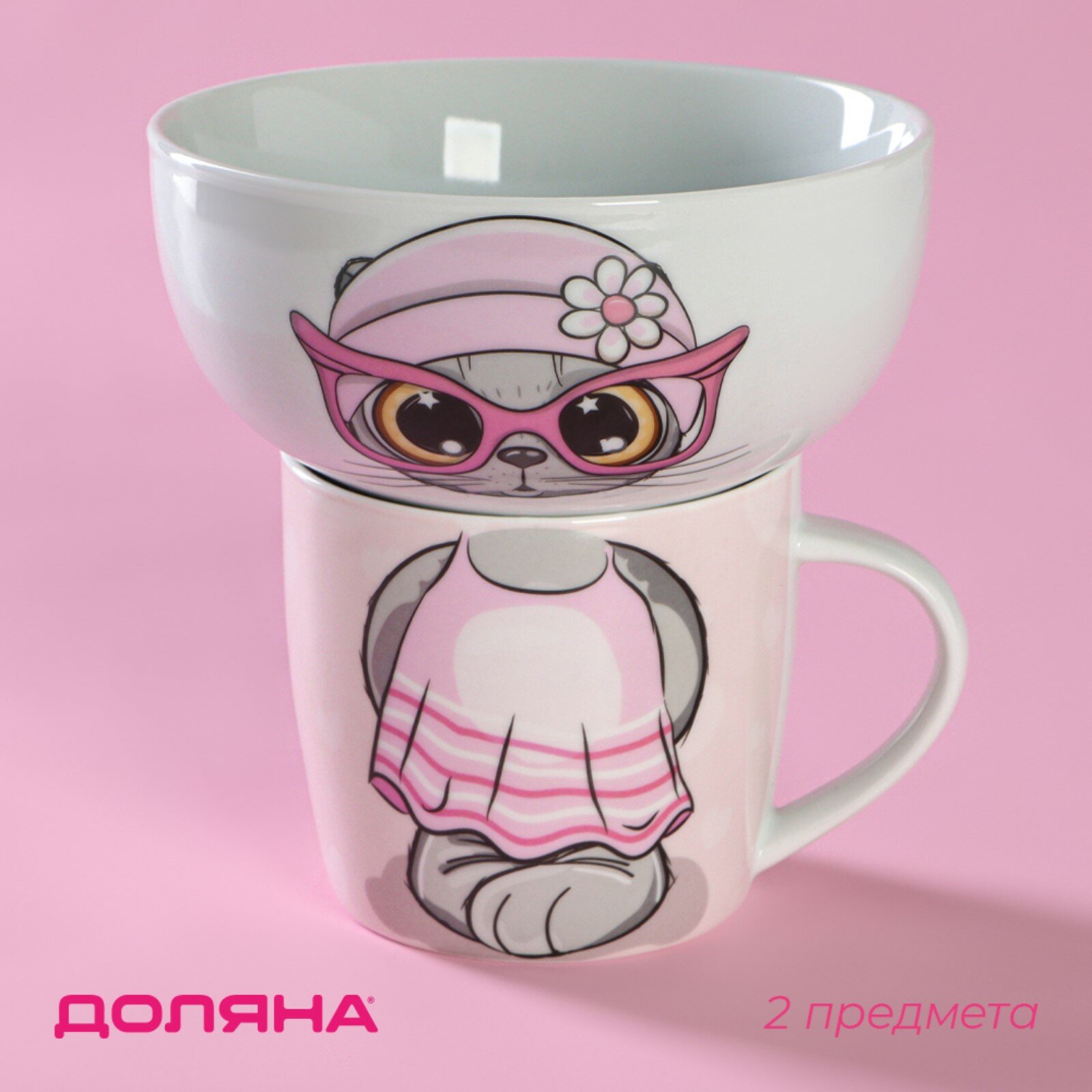 Набор детской посуды Доляна «Котик», 2 предмета: кружка 230 мл, миска 400 мл
