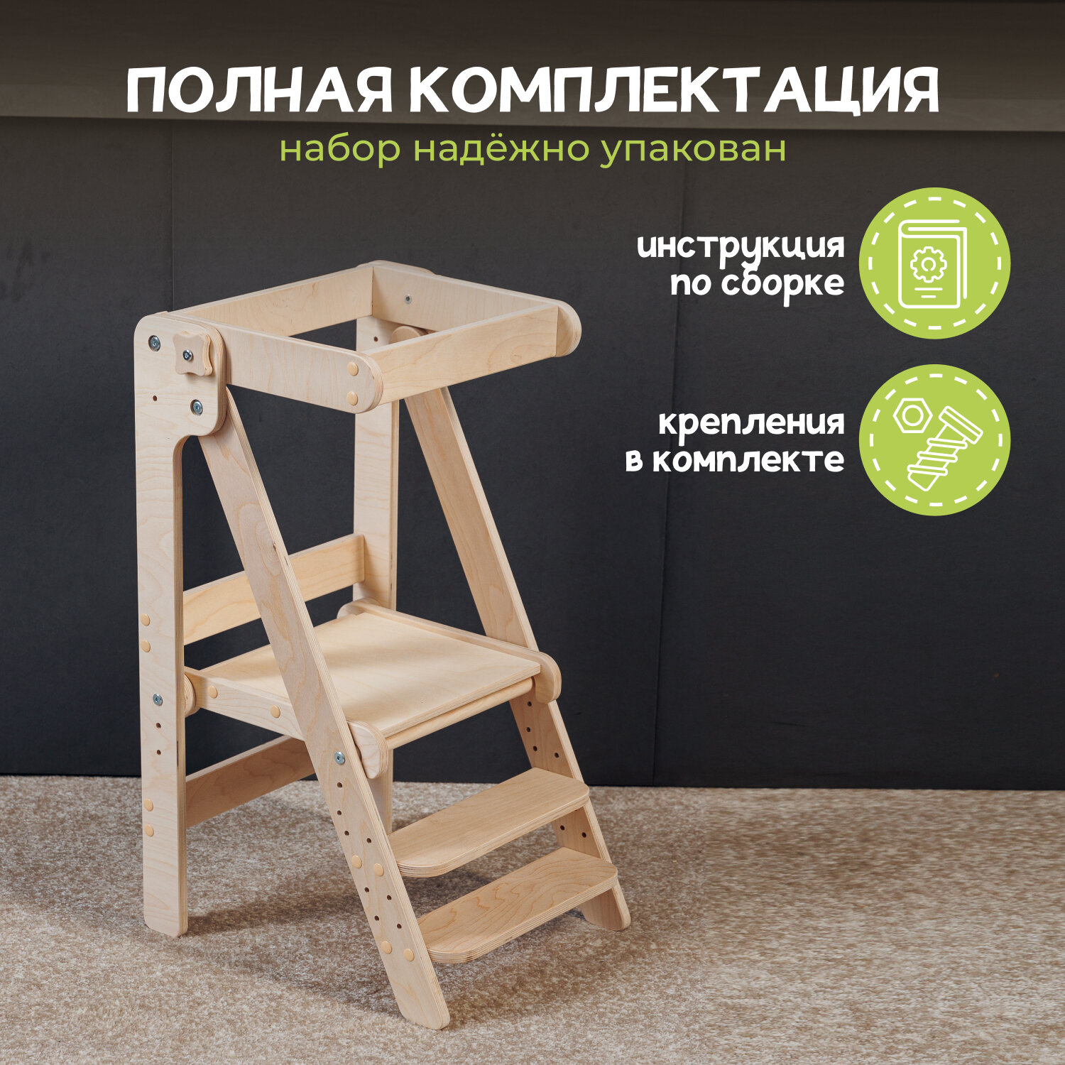 | Комплектация | башня помощника Монтессори / фурнитура / инструкция по сборке |