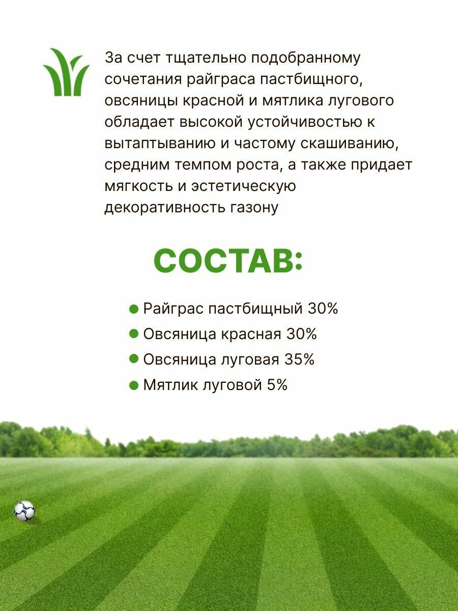 | Состав смеси | райграс пастбищный - 30%, овсяница красная - 30%, овсяница луговая - 20%, тимофеевка луговая - 15%, мятлик луговой - 5% |