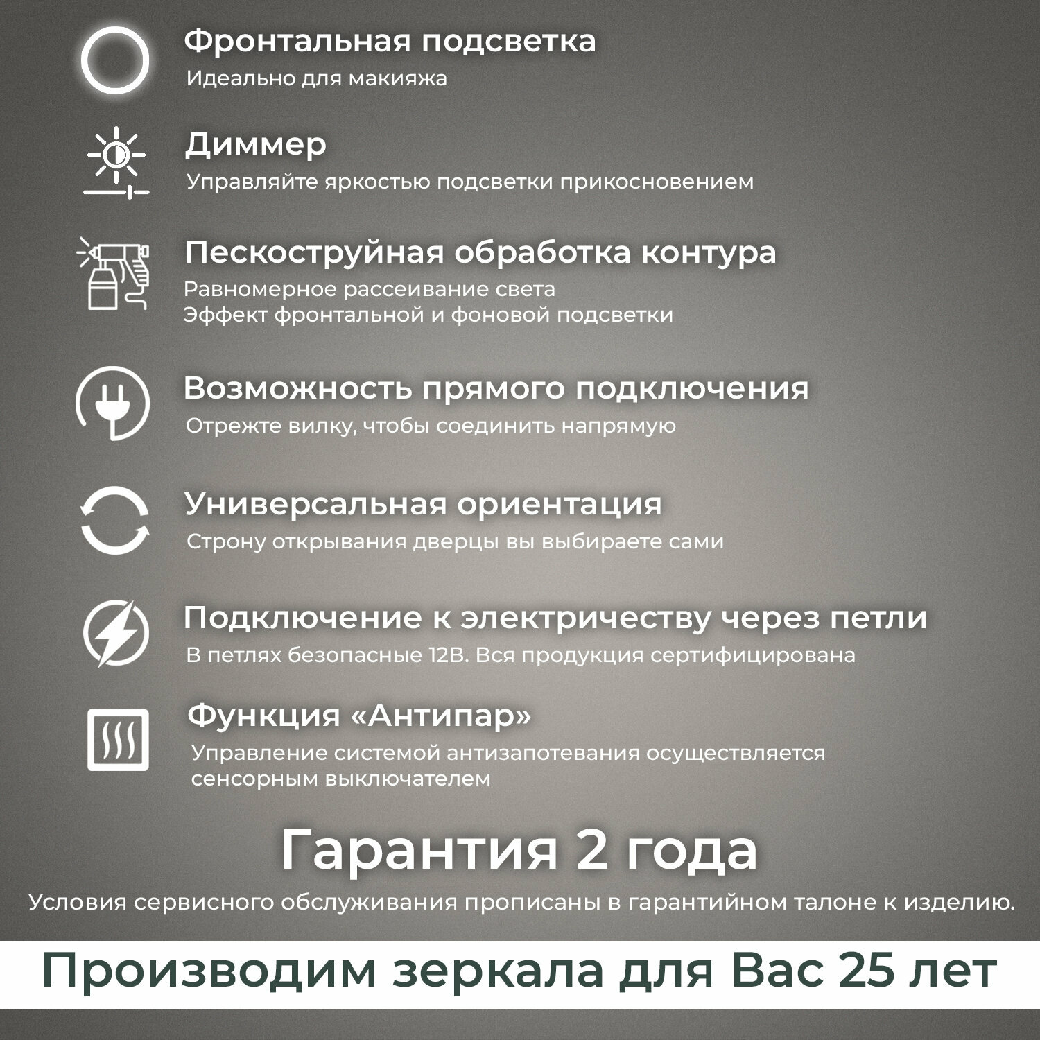 | Особенности | зеркало-шкаф, подсветка, регулировка яркости подсветки, с часами, сенсорный выключатель подсветки |