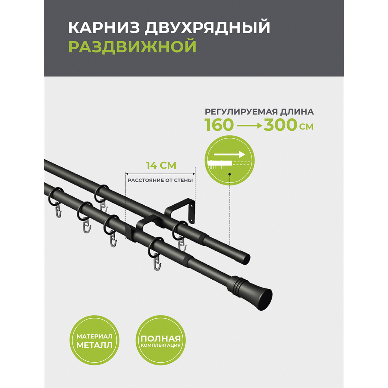Карниз настенный металлический двухрядный раздвижной 160-300 см d16/19 мм черный (151.211)