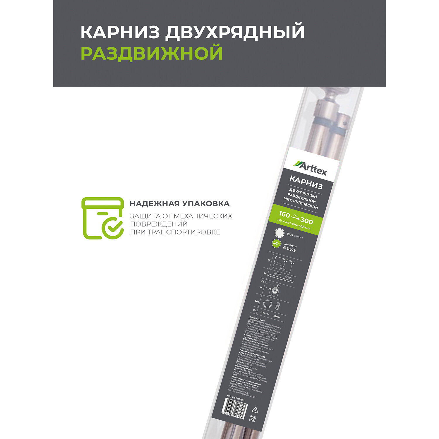 Карниз телескоп. 2-рядный arttex 160-300см 16/19мм черный наконечник конус, арт.246.551
