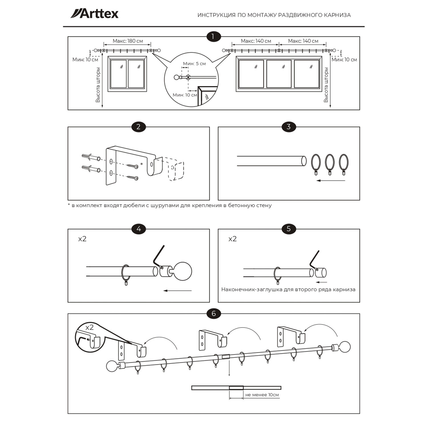 | Комплектация | Направляющая раздвижная - 2 шт, декоративные наконечники - 2 шт, заглушки - 2 шт, держатели - 3 шт, кольца с крючками - 50 шт, шурупы с дюбелями - 6 шт. |