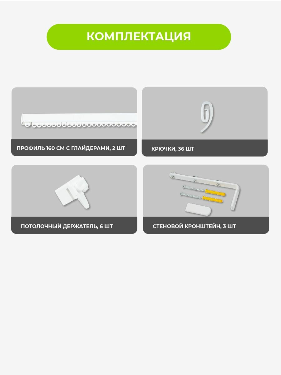 | Комплектация | Направляющая раздвижная - 1 шт, наконечники - 2 шт, держатели - 3 шт, кольца с крючками - 25 шт, шурупы с дюбелями - 6 шт. |