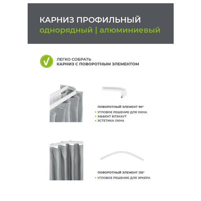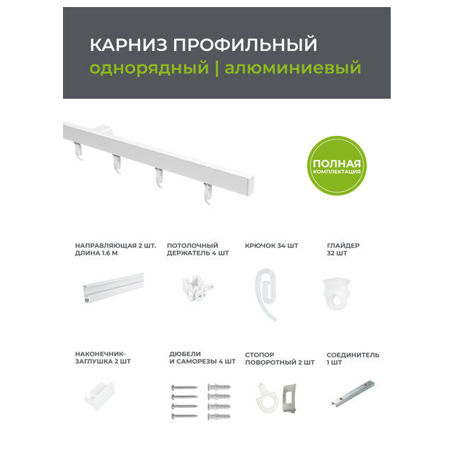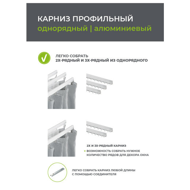 | Комплектация | Направляющая раздвижная - 1 шт, наконечники - 2 шт, держатели - 3 шт, кольца с крючками - 25 шт, шурупы с дюбелями - 6 шт. |