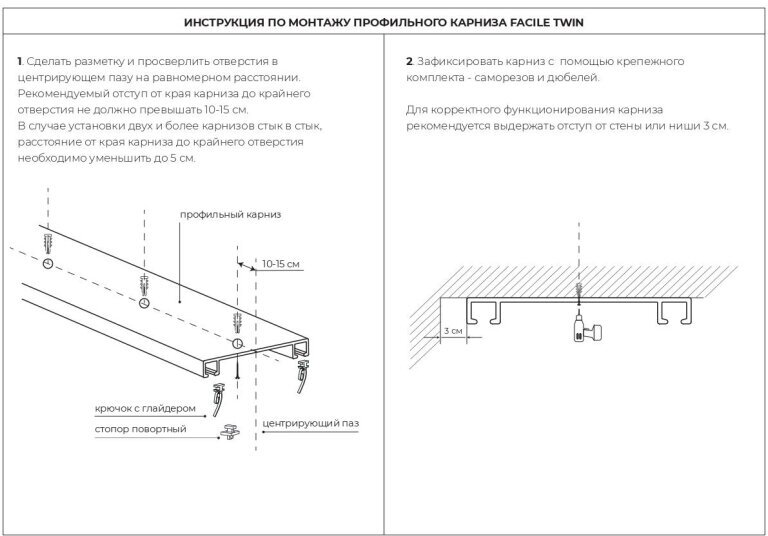 | Комплектация | Направляющая раздвижная - 1 шт, наконечники - 2 шт, держатели - 3 шт, кольца с крючками - 25 шт, шурупы с дюбелями - 6 шт. |