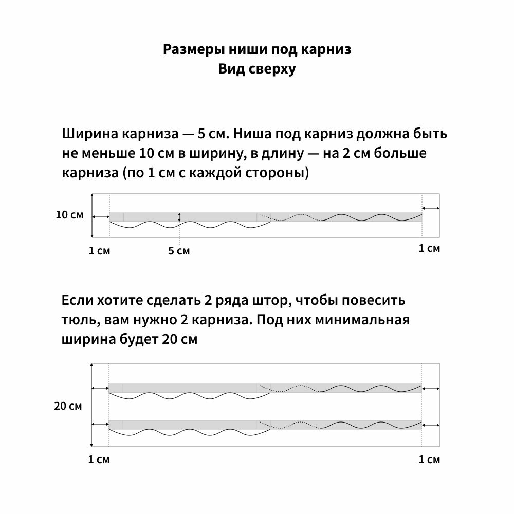 | Комплектация | Карниз — 1 шт, крючки — 36 шт, потолочные крепления — 13 шт, однорядные настенные крепления — 9 шт. |