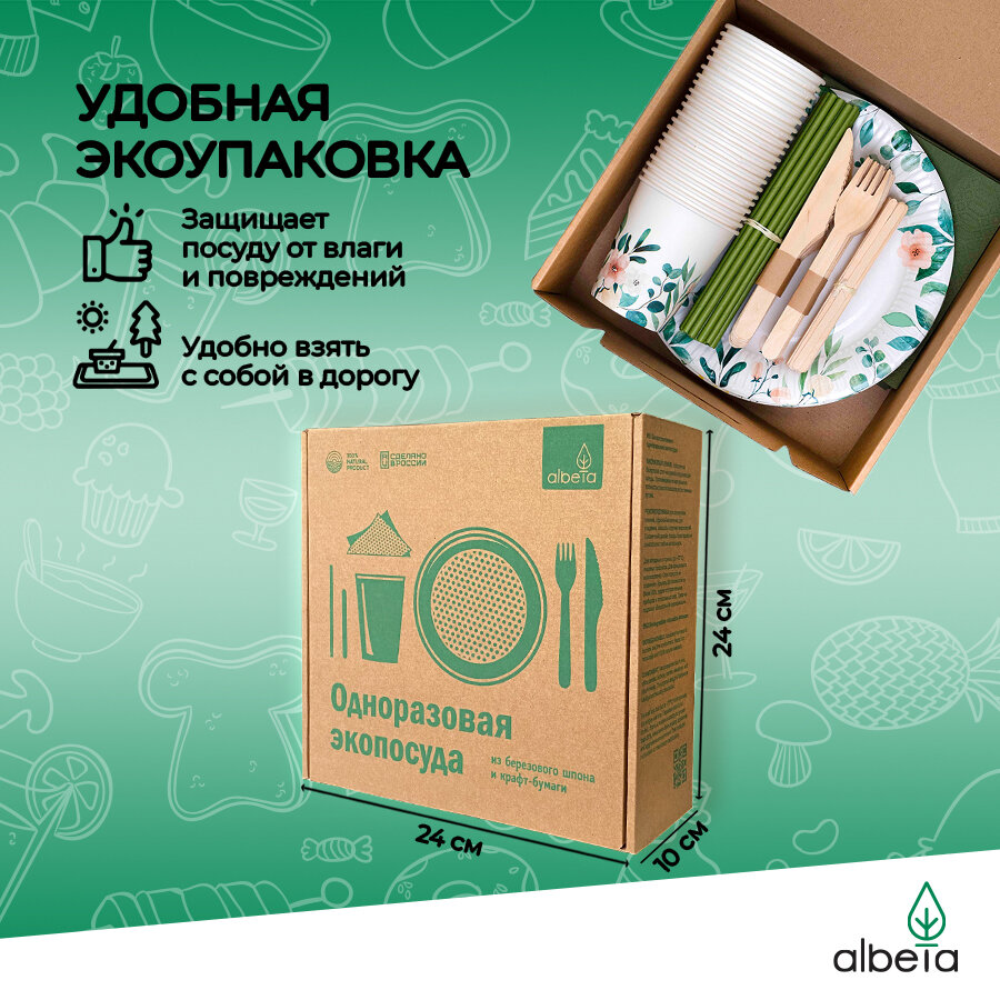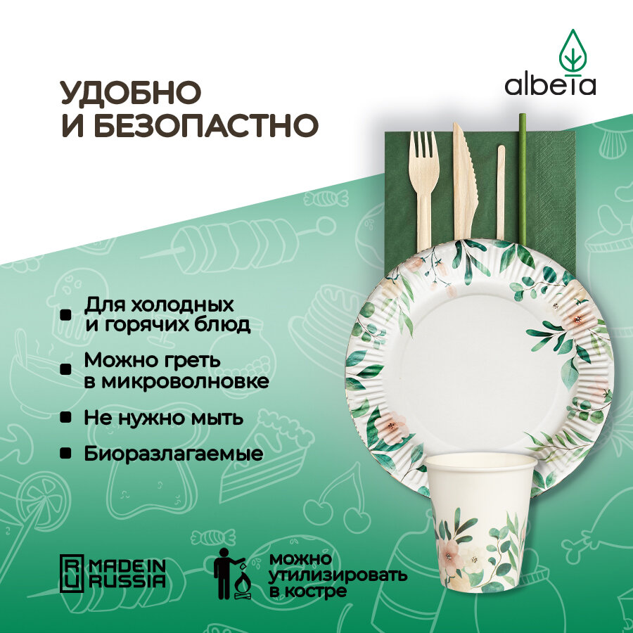 Одноразовая посуда, вилки, ножи, стаканчики, бумажные тарелки, набор одноразовой посуды для пикника и праздника на 20 персон, принт "Цветы"