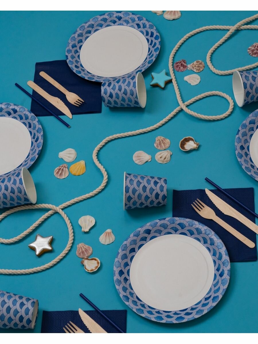 Купить Одноразовая посуда для праздника (тарелки, стаканчики, вилки, ножи) набор на 20 персон, принт "Волна"