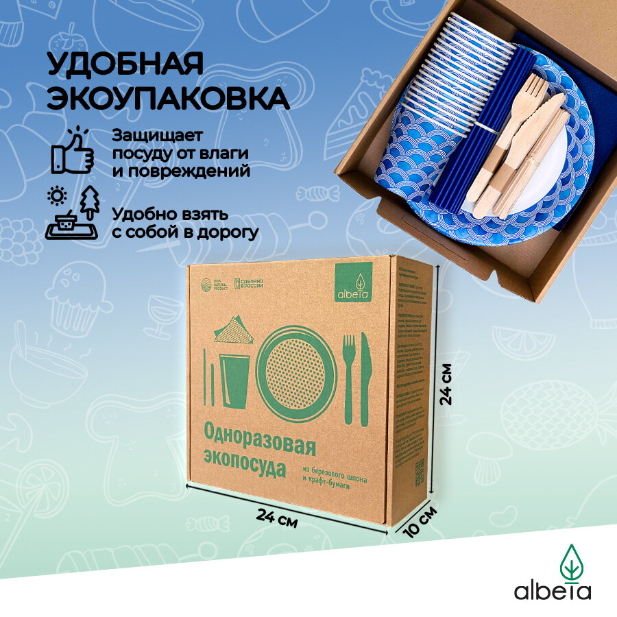 Одноразовая посуда, вилки, ножи, стаканчики, бумажные тарелки, набор одноразовой посуды для пикника и праздника на 20 персон, принт "Волна"