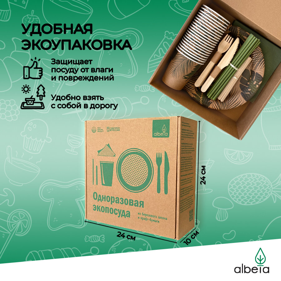 Одноразовая посуда, вилки, ножи, стаканчики, бумажные тарелки, набор одноразовой посуды для пикника и праздника на 20 персон, принт "Тропик"