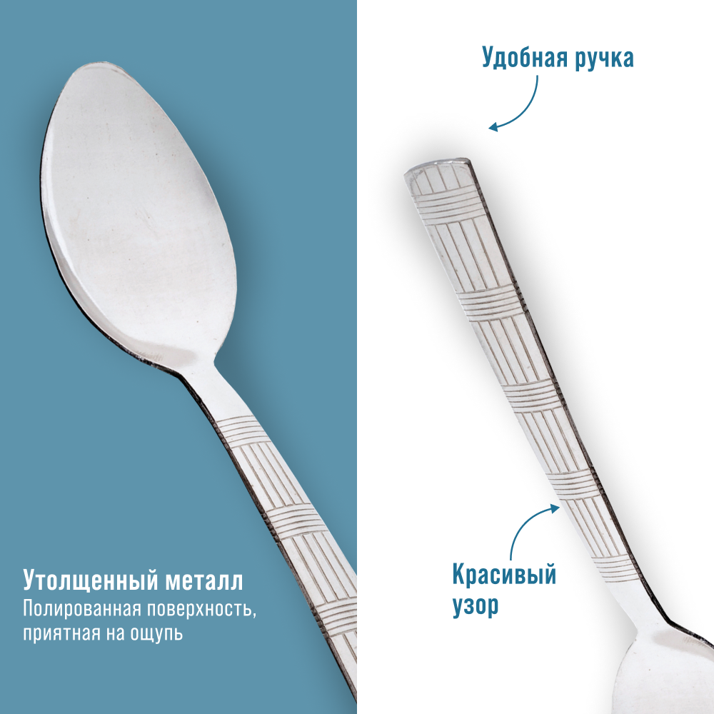 | Дополнительная информация | Размер приборов: столовая ложка 19х4 см, столовая вилка 20х2,6 см, чайная ложка 14,8х3 см. |