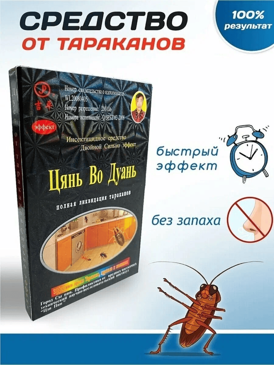 | Дополнительная информация | Порошок Цянь Во Дуань не только эффективно уничтожает тараканов, но и предотвращает их повторное появление |