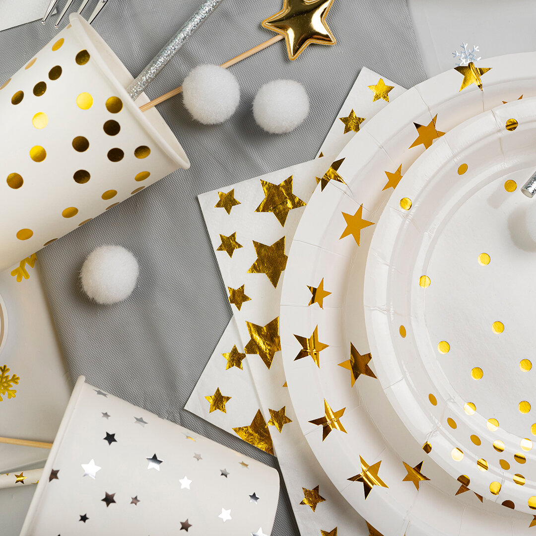 Скатерть одноразовая, Звезды, Белый/Золото, 137x274 см, 1 шт.