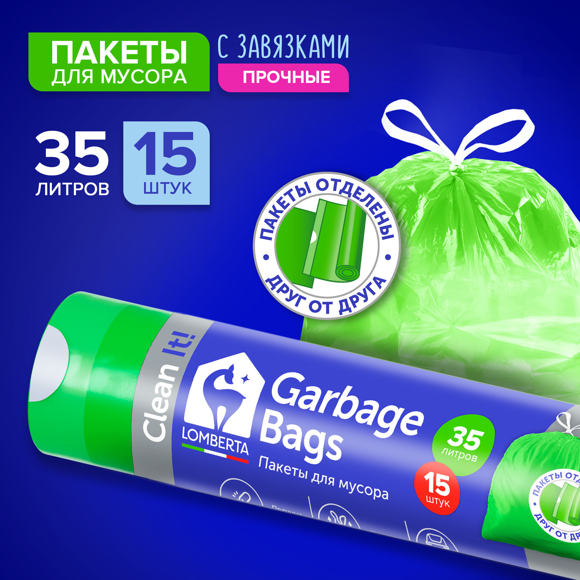 Мешки для мусора Lomberta 35 л, 15 шт, с завязками, плотные, в рулоне, пакеты уже оторваны