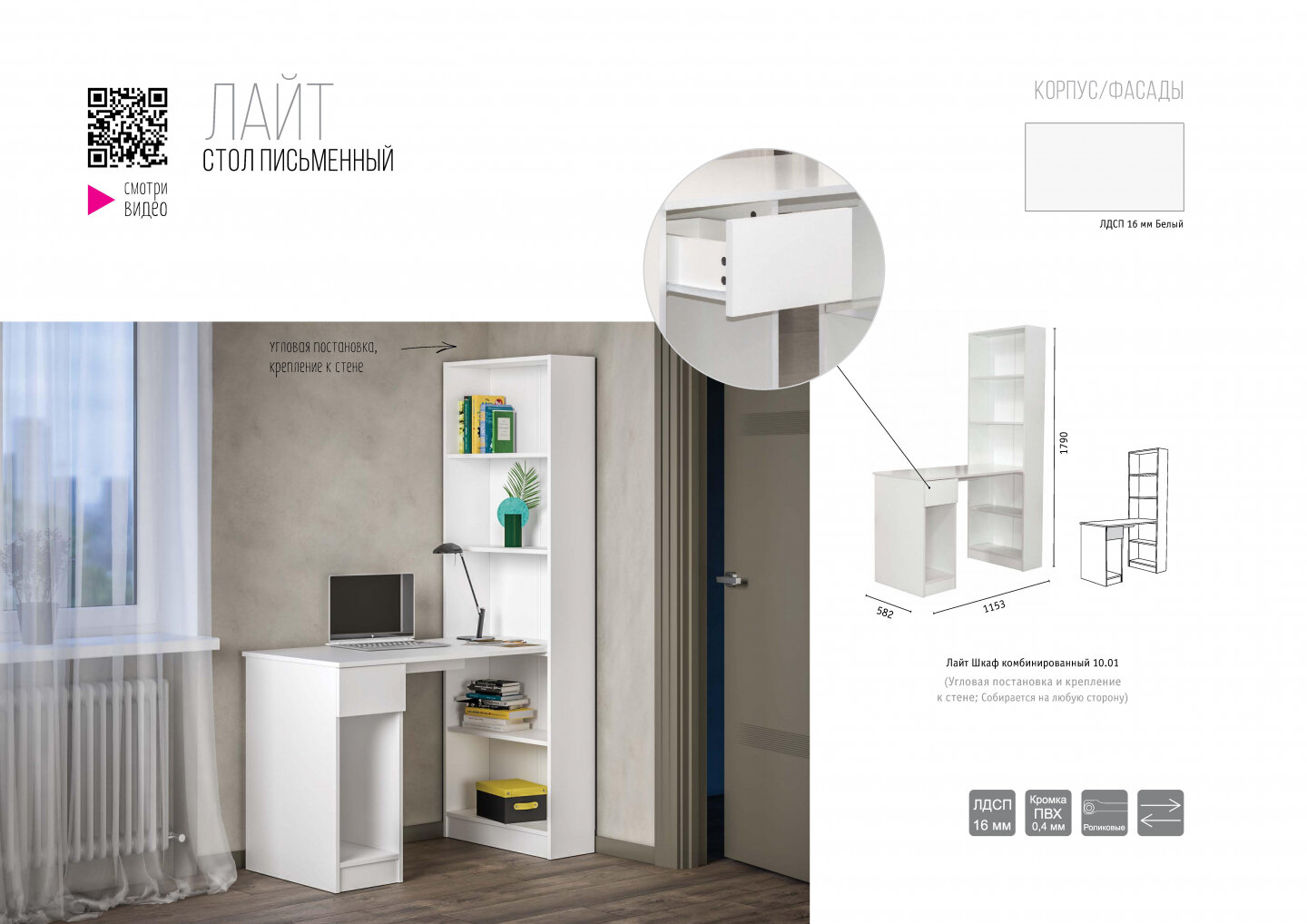 Стол письменный со стеллажом Mobi Лайт 10.01, ЛДСП, цвет белый интересное: