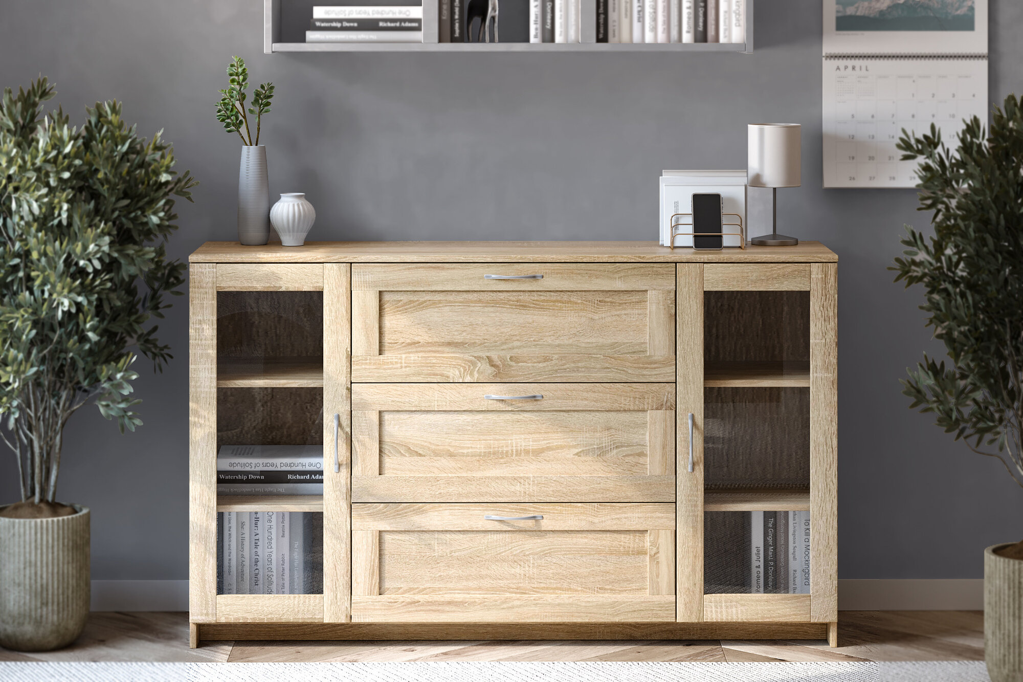 Тумба двухдверная, 117х95 см, с тремя выдвижными ящиками, двери со стеклом, сонома