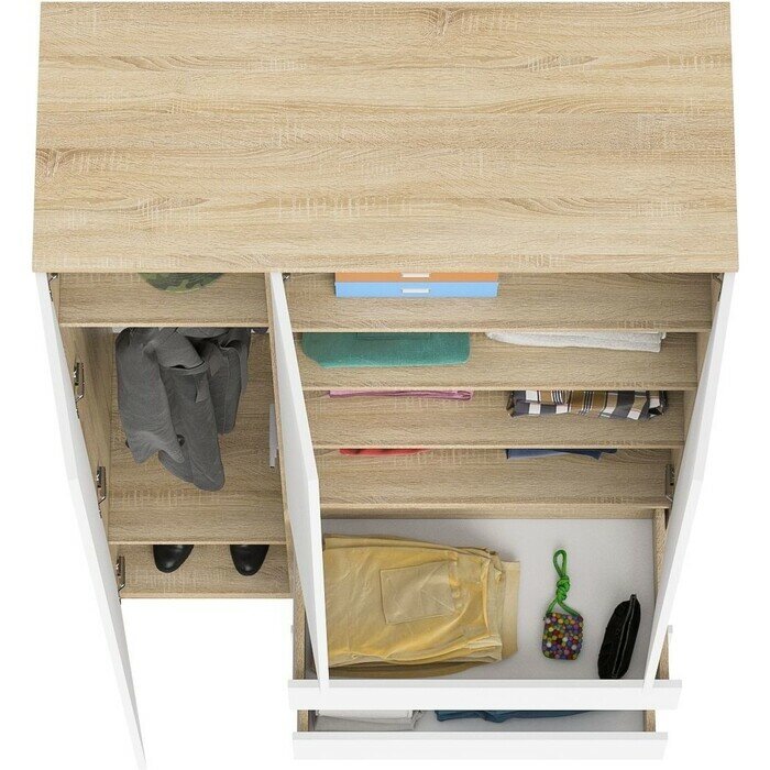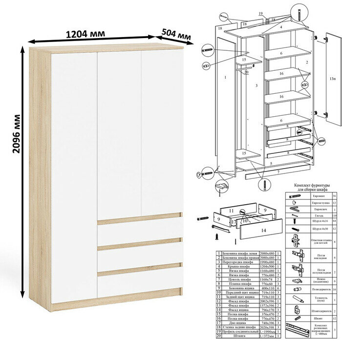 Шкаф для одежды распашной СВК Мори МШ1200.1, 3 двери, 3 ящика, цвет дуб сонома/белый интересное: