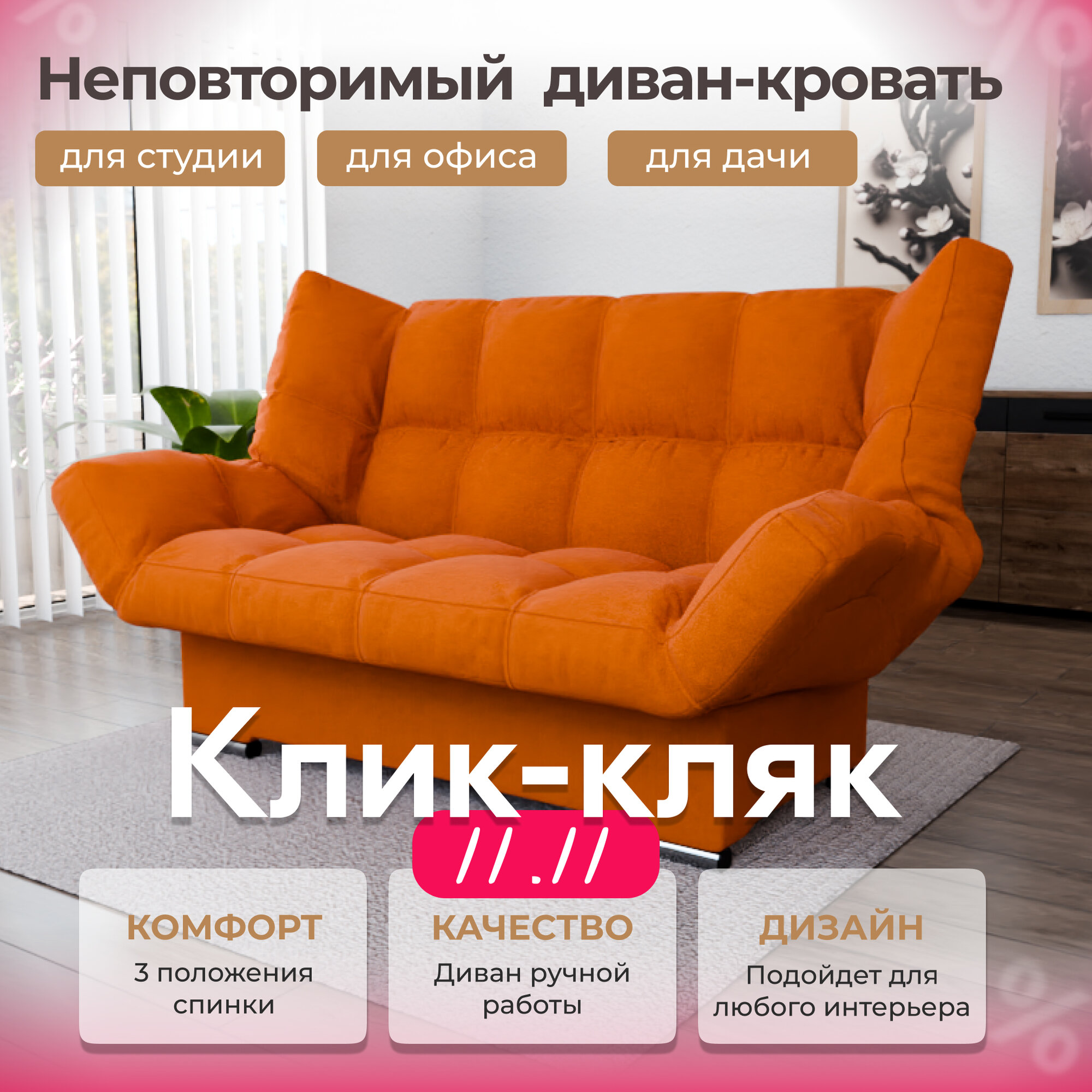 Диван-кровать "Klik-Klak" , YORCOM, Велютта люкс 62, размеры 175х100х100, Розовый