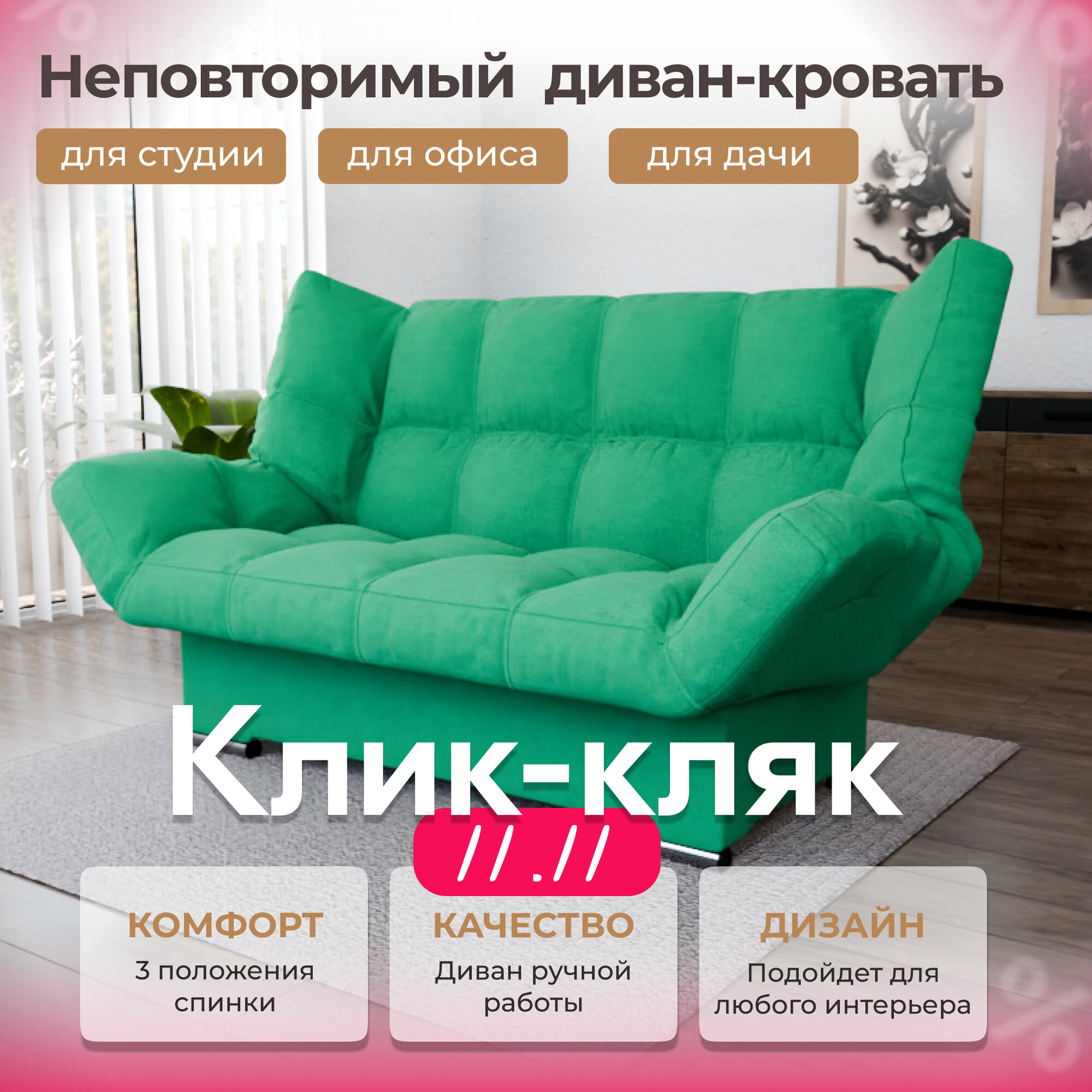 Диван-кровать "Klik-Klak" , YORCOM, Велютта люкс 42, размеры 175х100х100, Зеленый