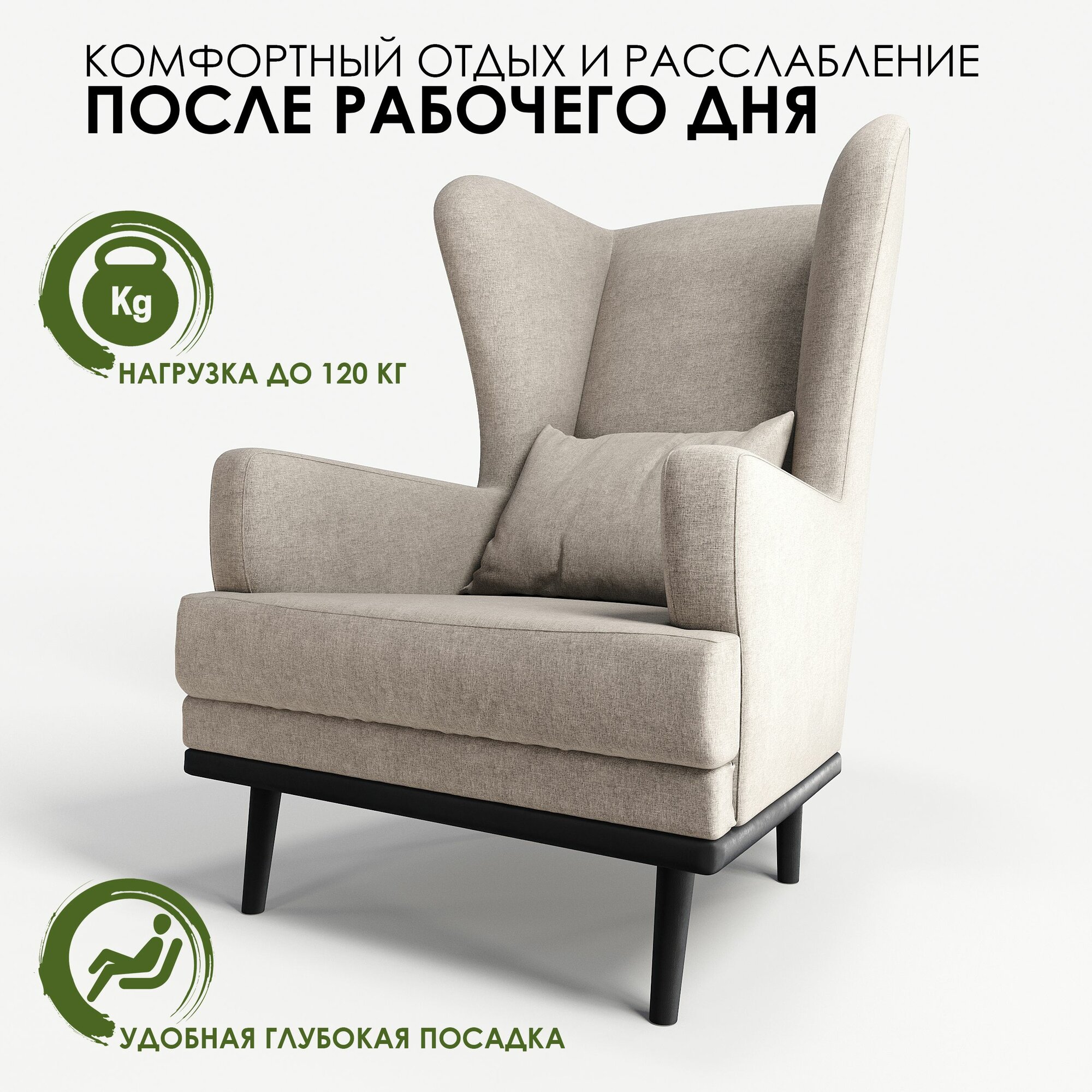 | Дополнительная информация | высокая полукруглая мягкая спинка с ушами, глубокая посадка под комфортным углом для отдыха, высокие ножки из массива бука |