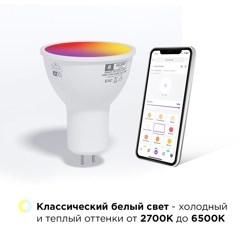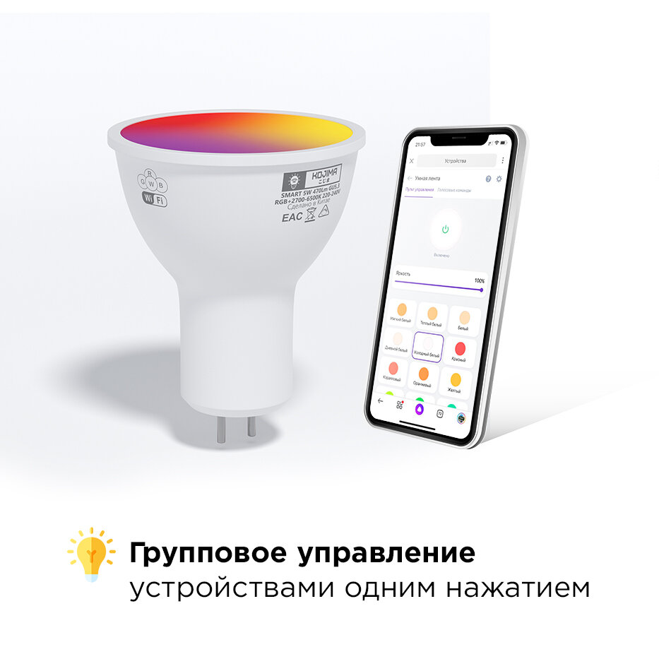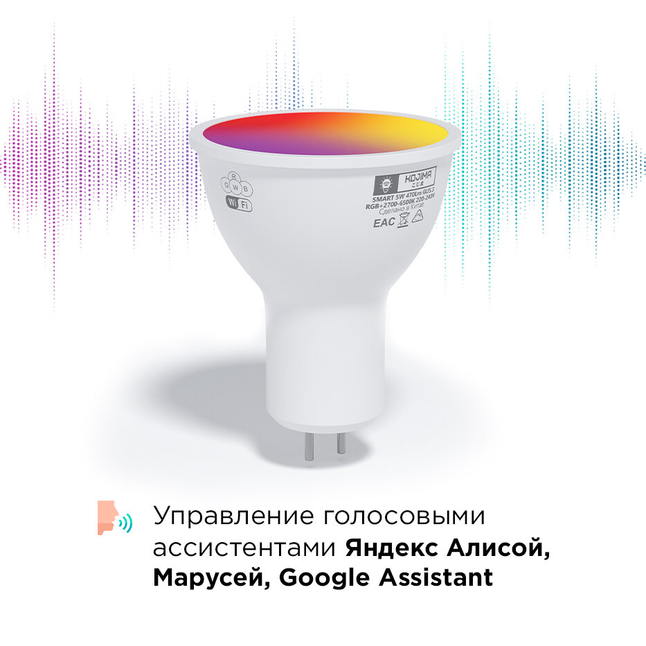 Умная лампочка KOJIMA RGB с Wi-Fi, Яндекс Алисой, Google Home, Smart Bulb 5W GU5.3