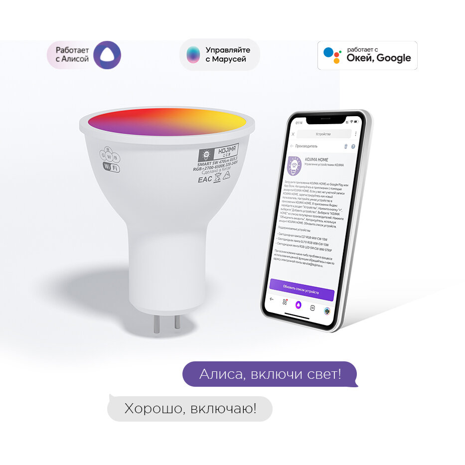 Ниже Вы можете прочитать отзывы на Умная лампочка KOJIMA RGB с Wi-Fi, Яндекс Алисой, Марусей, Google Home, Smart Bulb 5W GU5.3, ознакомится с подробными характеристиками, посмотреть интересные обзоры и фотографии на Умная лампочка KOJIMA RGB с Wi-Fi, Яндекс Алисой, Марусей, Google Home, Smart Bulb 5W GU5.3.