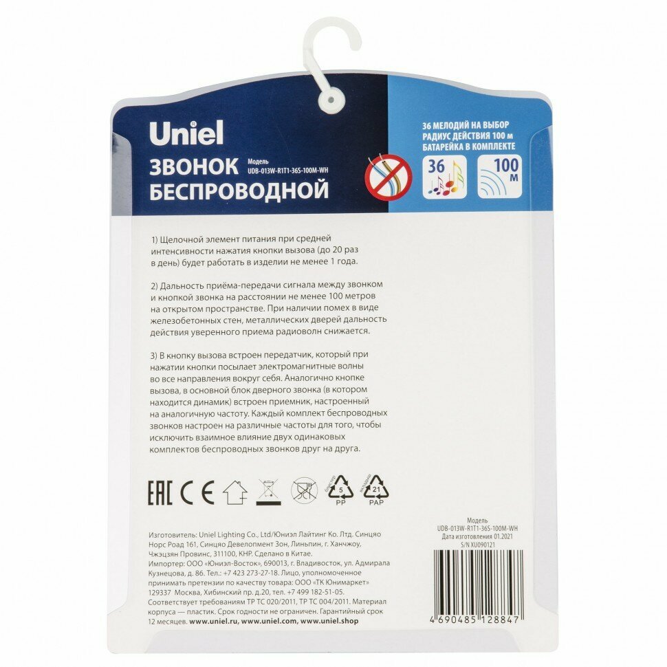 Купить Звонок беспроводной Uniel UDB-013W-R1T1-36S-100M-WH 36 мелодий. Радиус действия 100м. ТМ