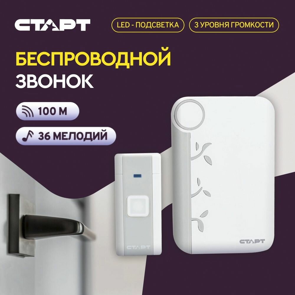 Старт 003 звонок беспроводной, 80м, 36 мелодий, индикатор, 3 ур.громкости, 65-85дБ