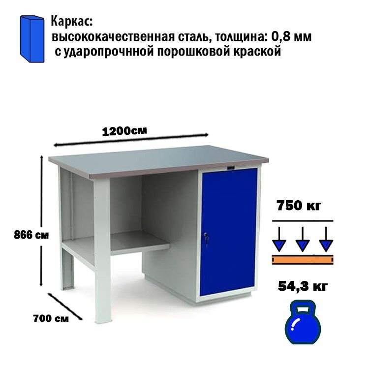 Стол верстак слесарный металлический с тумбой с дверью, 1200 мм, практик PROFI (№201) WT120. WD1/F1.000