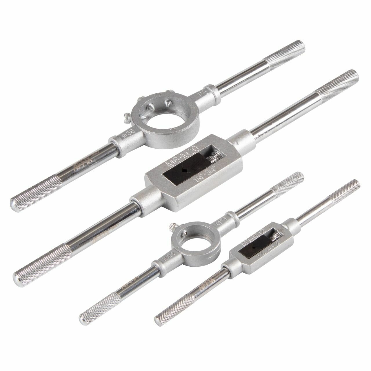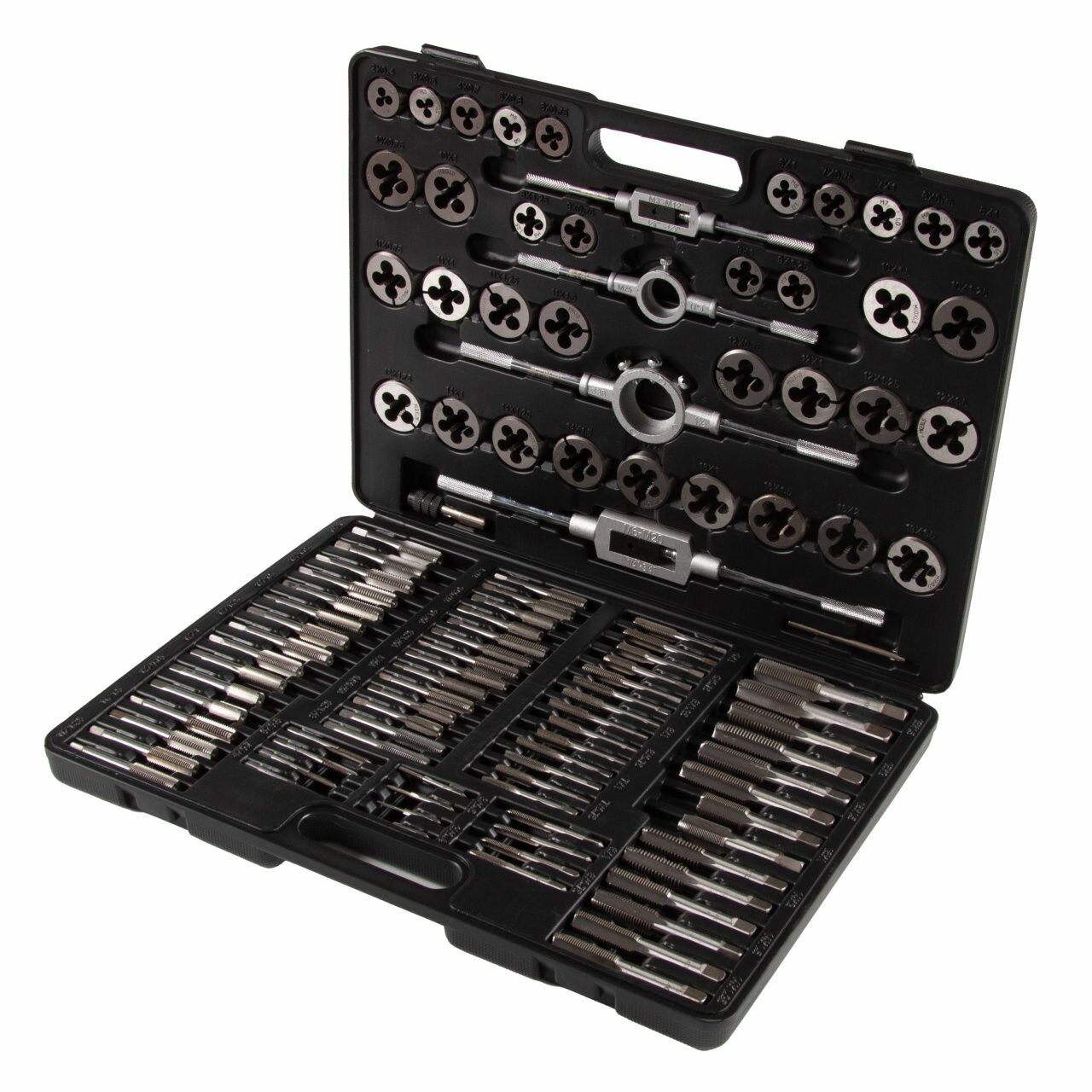 | Подробная комплектация | – Метчики 70 шт. (по 2 шт. на размер) – Плашки 35 шт. – Метчикодержатель Т-типа M3-M12 – Метчикодержатель Т-типа M6-M20 – Плашкодержатель Ø 25 мм – Плашкодержатель Ø 38 мм – Метчикодержатель патронный M3-M6 – Пластиковый кейс |