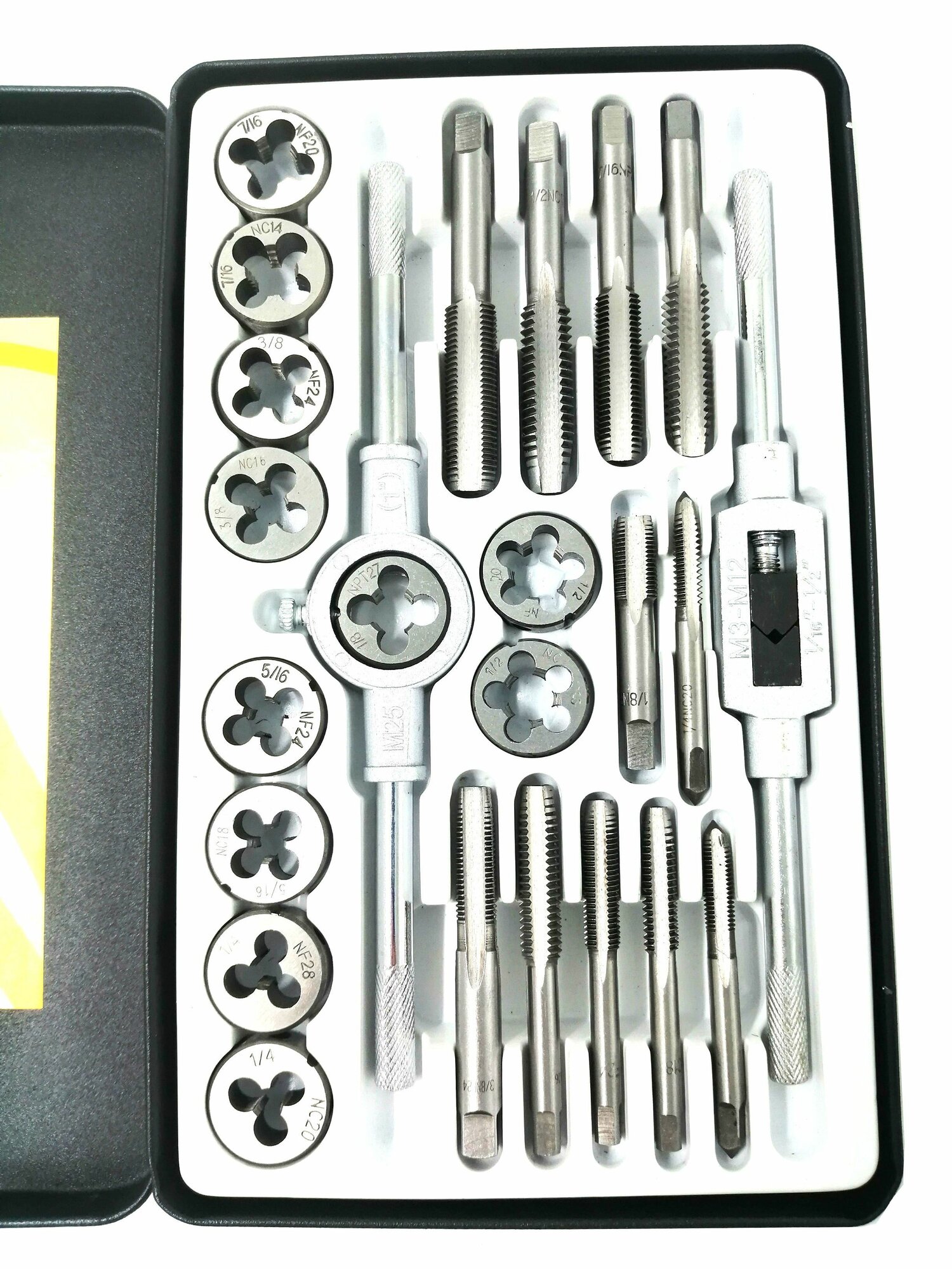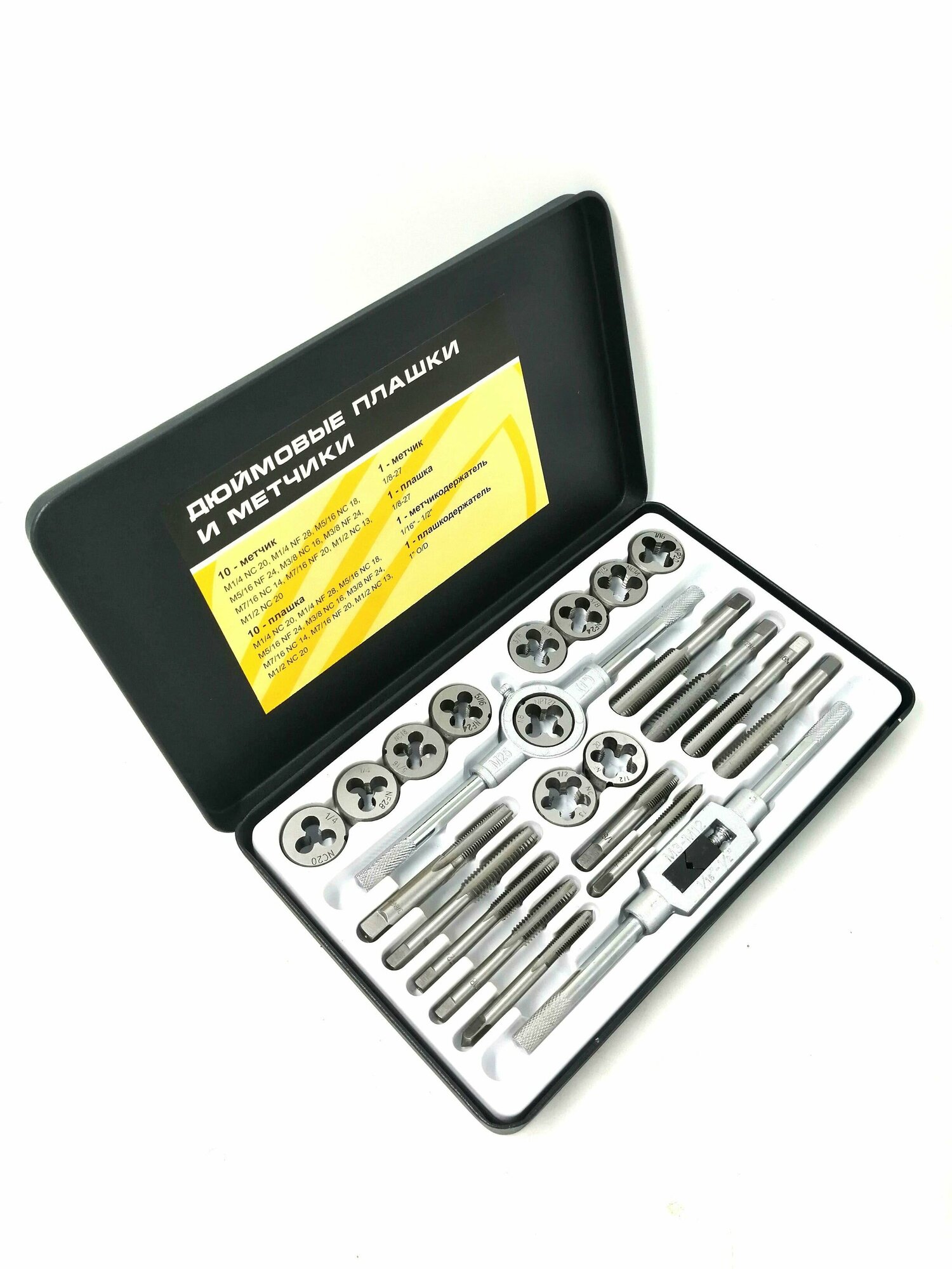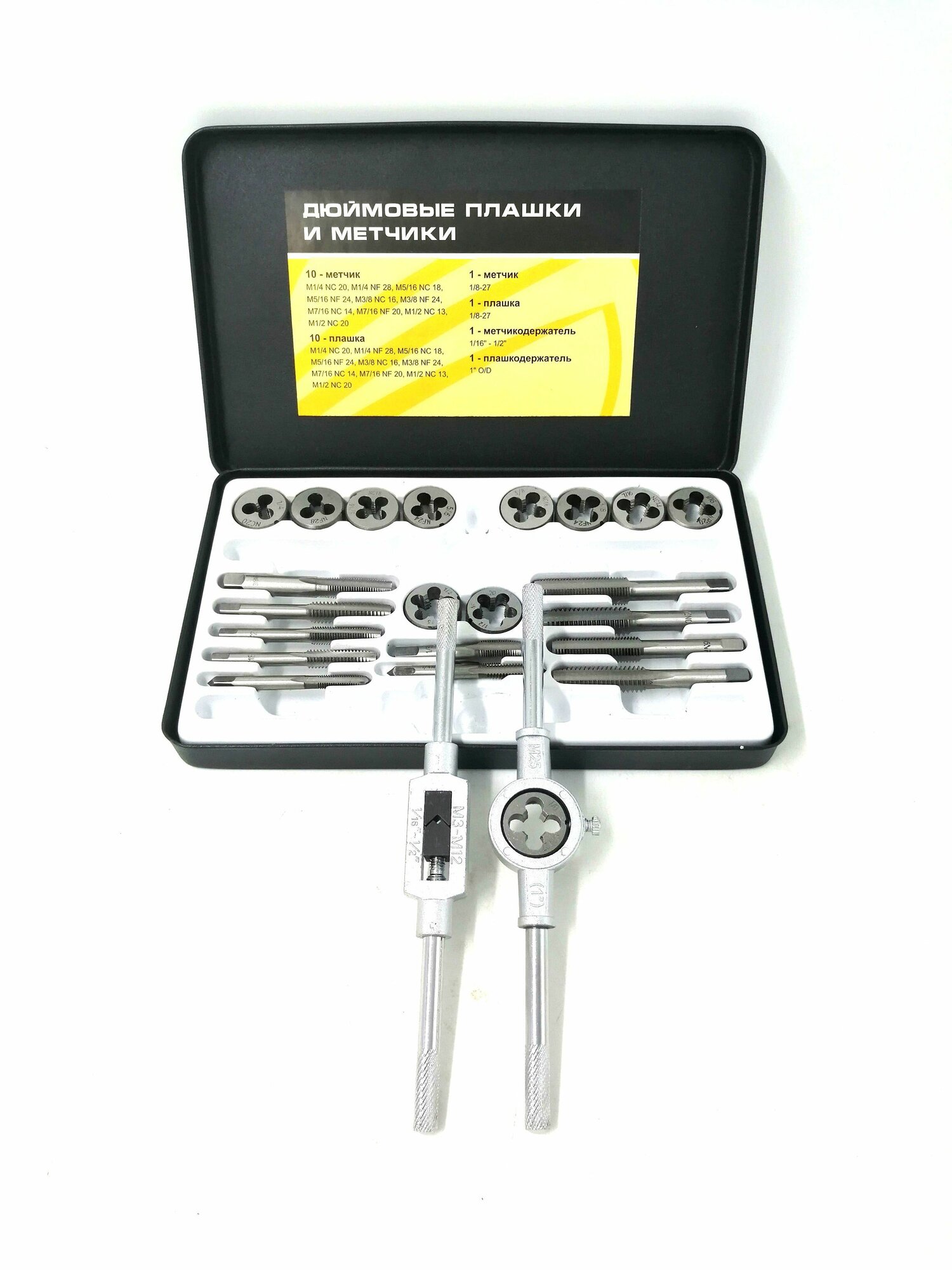 | Подробная комплектация | - метчики (10 шт): M1/4 NC 20, M1/4 NF 28, M5/16 NC 18, M5/16 NF 24, M3/8 NC 16, M3/8 NF 24, M7/16 NC 14, M7/16 NF 20, M1/2 NC 13, M1/2 NC 20; - плашки (10 шт): M1/4 NC 20, M1/4 NF 28, M5/16 NC 18, M5/16 NF 24, M3/8 NC 16, M3/8 NF 24, M7/16 NC 14, M7/16 NF 20, M1/2 NC 13, M1/2 NC 20; - метчик: 1/8-27; -плашка: 1/8-27; - метчикодержатель: 1/16"-1/2; - плашкодержатель: 1"; - пластиковый кейс. |