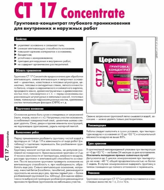 Грунтовка Ceresit ст17 Concentrate (концентрат) Укрепляющая, Обеспыливающая 10 кг интересное: