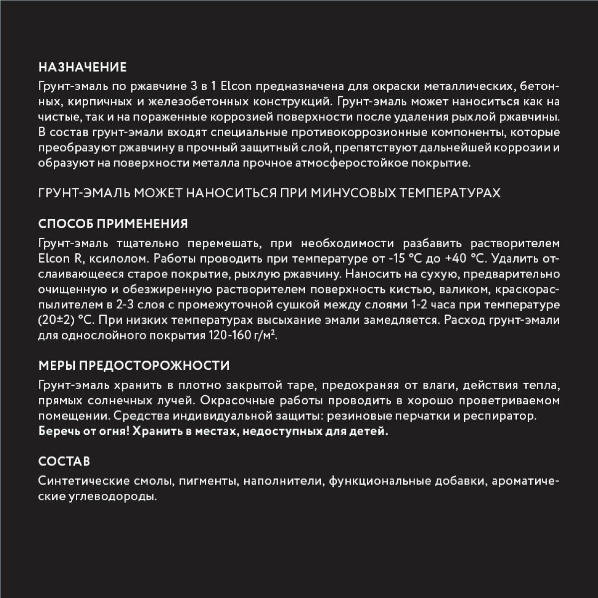 | Дополнительная информация | Грунт-эмаль по ржавчине Elcon 3 в 1 предназначена для нанесения как на чистые, так и на пораженные коррозией металлические поверхности с целью создания надежной антикоррозионной защиты металлоконструкций, оборудования, металлических изделий.Грунт-эмаль можно наносить на прокорродировавшую поверхность после удаления рыхлой ржавчины. Компоненты, входящие в состав грунт-эмали, преобразуют ржавчину в прочный защитный слой, препятствуют дальнейшей коррозии и образуют на поверхности металла прочное атмосферостойкое покрытие.Грунт-эмаль может наноситься при отрицательных температурах до -20 ºС, время сушки «на отлип» при температуре +20 ºС составляет не более 1 часа. |