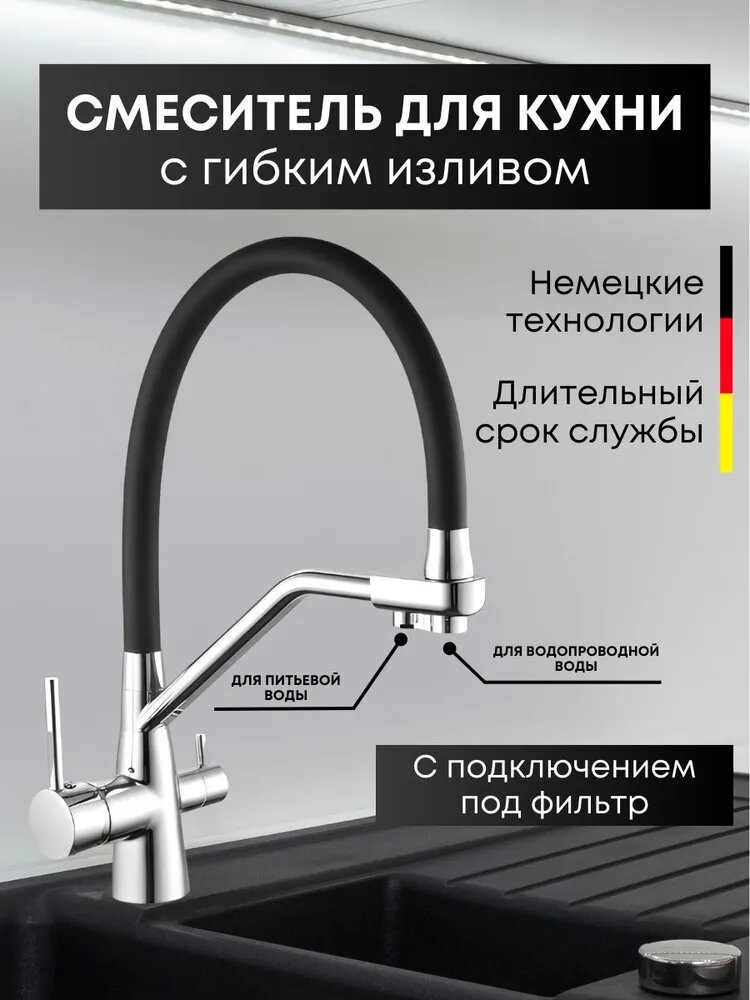 Смеситель для кухни с подключением под фильтром, кран с гибким изливом для раковины Fenix черный матовый (латунь, нержавеющая сталь) поворотный