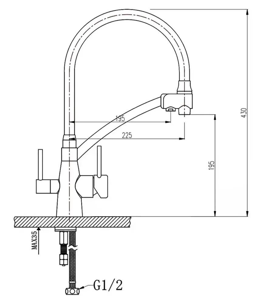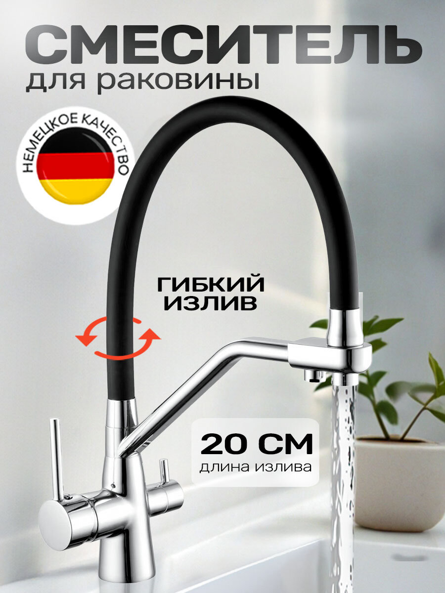 | Комплектация | Смеситель - 1 шт, гибкая подводка для холодной и горячей воды (60 см) - 2 шт, гибкая подводка для питьевой воды (30 см) - 1 шт, полный набор крепежа |